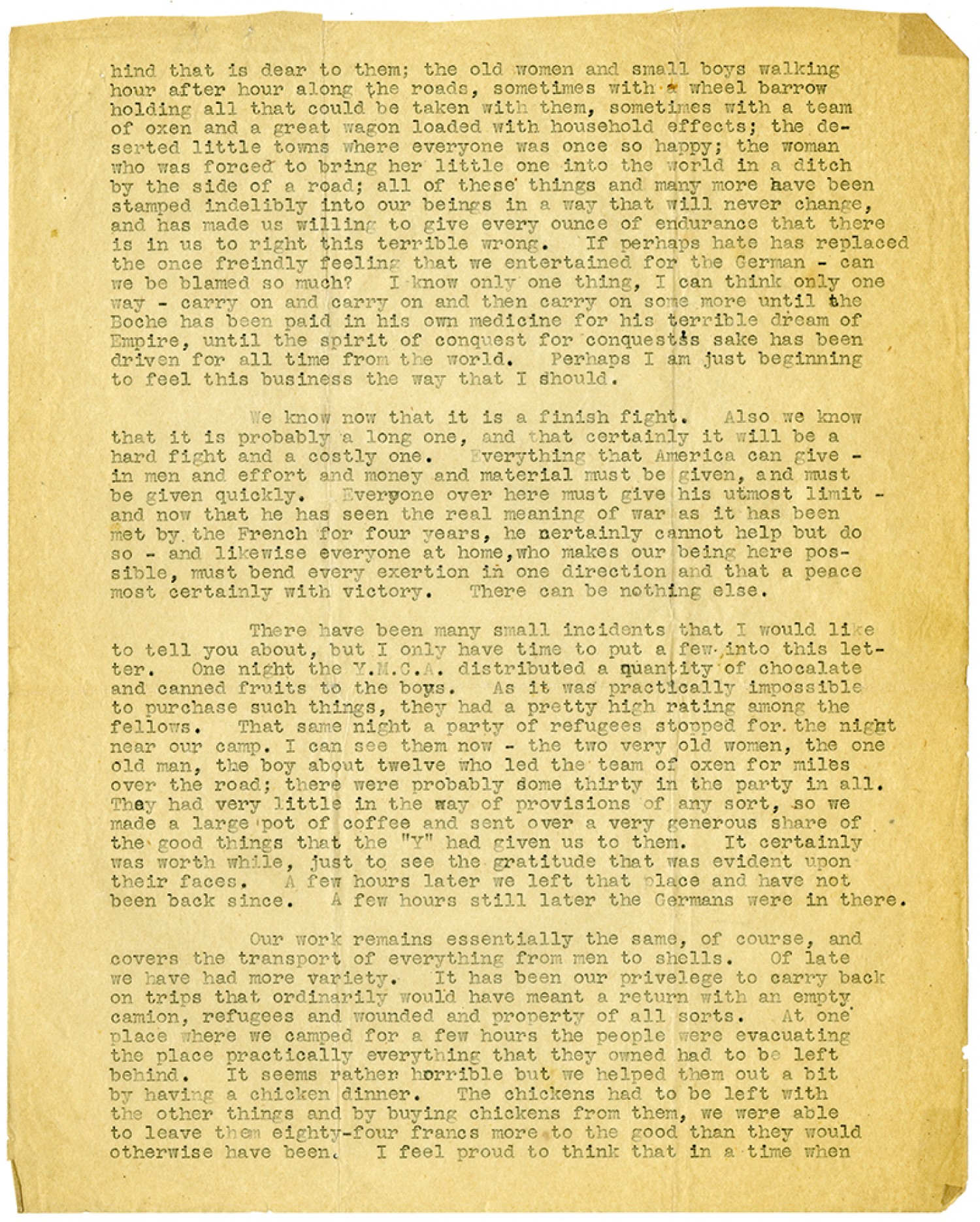 hind that is dear to them; the old women and small boys walking after hour along the roads, sometimes with a wheel barrow holding all that could be taken with them, sometimes with a team of oxen and a great wagon loaded with household effects; the deserted little towns where everyone was once so happy; the women who was forced to bring her little one into the world in a ditch by the side of a road; all of these things and many more have been stamped indelibly into our beings in a way that will never change, and has made us willing to give every ounce of endurance that there is in us to right this terrible wrong. If perhaps hate has replaced the once freindly feeling that we entertained for the German - can we be blamed so much? I know only one thing, I can think only one way - carry on and carry on and then carry on some more until the Boche has been paid in his own medicine for his terrible dream of Empire, until the spirit of conquest for conquests's sake has been driven for all time from the world. Perhaps I am just beginning to feel this business the way that I should. We know now that it is a finish fight. Also we know that it is probably a long one, and that certainly it will be a hard fight and a costly one. Everything that America can give - in men and effort and money and material must be given, and must be given quickly. Everyone over here must give his utmost limit - and now that he has seen the real meaning of war as it has been met by the French for four years, he certainly cannot help but do so - and likewise everyone at home, who makes our being here possible, must bend every exertion in our direction and that a peace most certainly with victory. There can be nothing else. There have been many small incidents that I would like to tell you about, but I only have time to put a few into this letter. One night the Y.M.C.A. distributed a quantity of chocolate and canned fruits to the boys. As it was practically impossible to purchase such things, they had a pretty high rating among the fellows. That same night a party of refugees stopped for the night near our camp. I can see them now - the two very old women, the one old man, the boy about twelve who led the team of oxen for miles over the road; there were probably some thirty in the party in all. They had very little in the way of provisions of any sort, so we made a large pot of coffee and sent over a very generous share of the good things that the "Y" had given us to them. It certainly was worth while, just to see the gratitude that was evident upon their faces. A few hours later we left that place and have not been back since. A few hours still later the Germans were in there. Our work remains essentially the same, of course, and covers the transport of everything from men to shells. Of late we have had more variety. It has been our privelege to carry back on trips that ordinarily would have meant a return with an empty camion, refugees and wounded and property of all sorts. At one place where we camped for a few hours the people were evacuating the place practically everything that they owned had to be left behind. It seems rather horrible but we helped them out a bit by having a chicken dinner. The chickens had to be left with the other things and by buying chickens from them, we were able to leave the eight0four francs more to the good than they would otherwise have been. I feel proud to think that in a time when