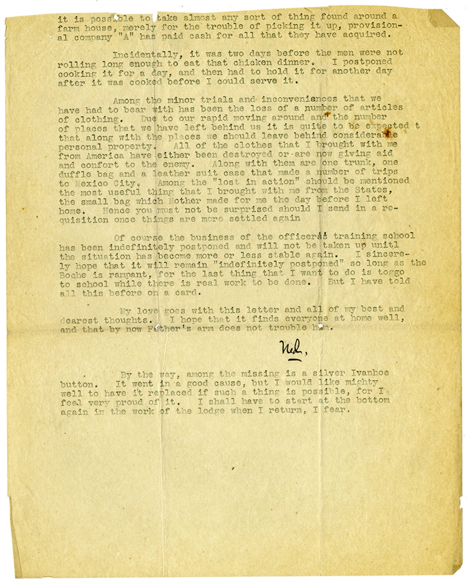it is possible to take almost any sort of thing found around a farm house, merely for the trouble of picking it up, provisional company "A" has paid cash for all that they have acquired. Incidentally, it was two days before the men were not rolling long enough to eat that chicken dinner. I postponed cooking it for a day, and then had to hold it for another day after it was cooked before I could serve it. Among the minor trials and inconveniences that we have had to bear with has been the loss of a number of articles of clothing. Due to our rapid moving around and the number of places that we have left behind us it is quite to be expected that along with the places we should leave behind considerable personal property. All of the clothes that I brought with me from America have either been destroyed or are now giving aid and confort to the enemy. Along with them are one trunk, one duffle bag and a leather suit case that made a number of trips to Mexico City. Among the "lost in action" should be mentioned the most useful thing that I brought with me from the States, the small bag which Mother made for me the day before I left home. Hence you must not be surprised should I send in a requisition once things are more settled again Of course the business of the officers's training school has been indefinitely postponed and will not be taken up until the situation has become more or less stable again. I sincerely hope that it will remain "indefinitely postponed" so long as the Boche is rampant, for the last thing that I want to do it to go to school while there is real work to be done. But I have told all this before on a card. My love goes with this letter and all of my best and dearest thoughts. I hope that it finds everyone at home well, and that by now Father's arm does not trouble him. Ned. By the way, among the missing is a silver Ivanhoe button. It went in a good cause, but I would like mighty well to have it replaced if such a thing is possible, for I feel very proud of it. I shall have to start at the bottom again in the work of the lodge when I return, I fear.
