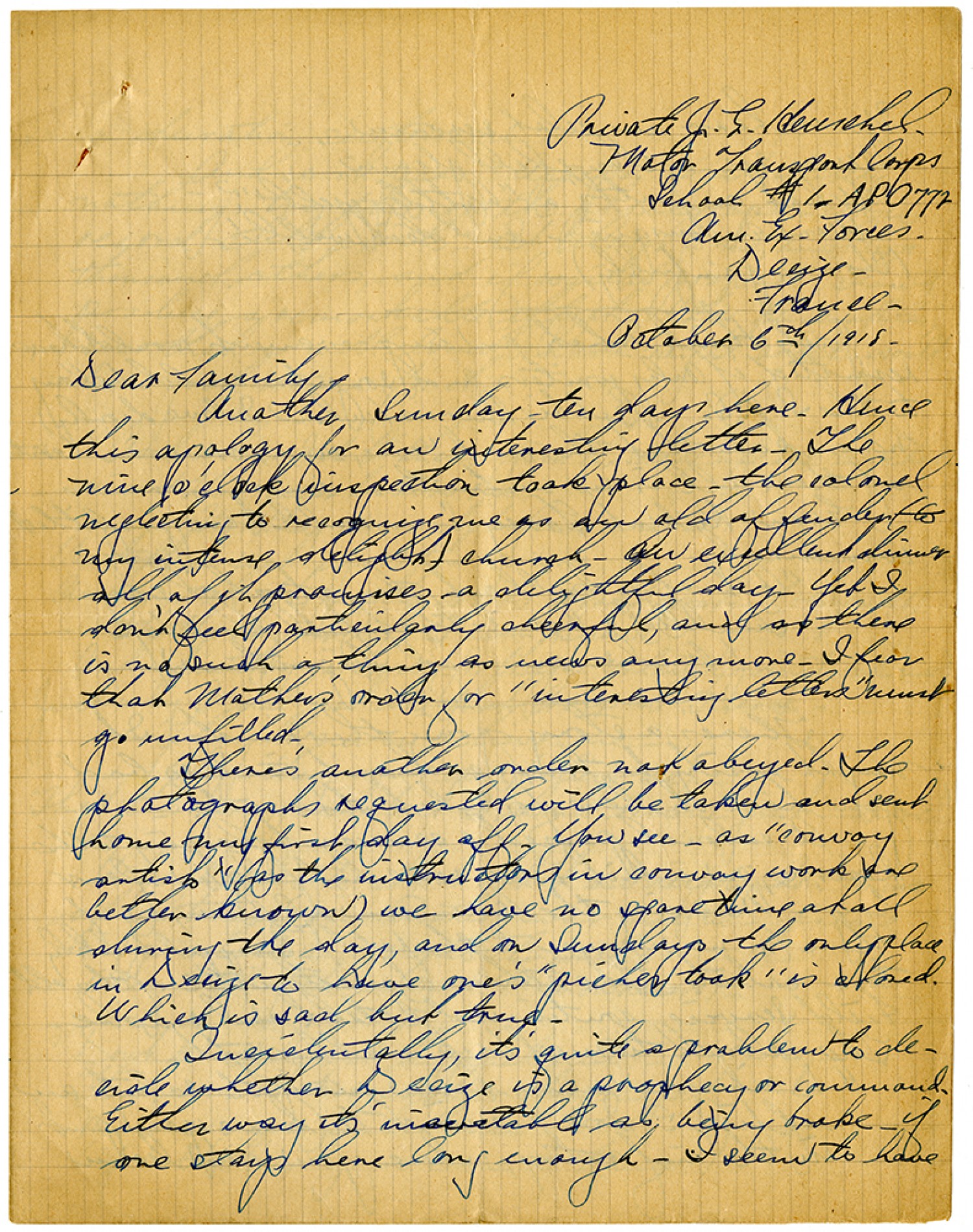 Private J.E. Henschel. Motor Transport Corps School #1. APO 772 Am. Ex. Forces. Decize - France - October 6th/1918 - Dear Family - Another Sunday - ten days here. Hence this apology for an interesting letter. The nine o'clock inspection took place - the colonel neglecting to recognize me as an old offender (to my intense delight) - church. An excellent dinner all of it promises a delightful day. Yet I don't feel particularly cheerful, and as there is no such a thing as news any more - I fear that Mother's order for "interesting letters" must go unfilled. There's another order not obeyed. The photographs requested will be taken and sent home my first day off. You see - as "convoy artist" (as the instructors in convoy work are better known) we have no spare time at all during the day, and on Sundays the only place in Decize to have one's "picher took" is closed. Which is sad but true. Incidentally, it's quite a problem to decide whether Decize is a prophecy or command. Either way it's [ms illegeible: 1 wd] as being broke - if one stays here long enough. I seem to have
