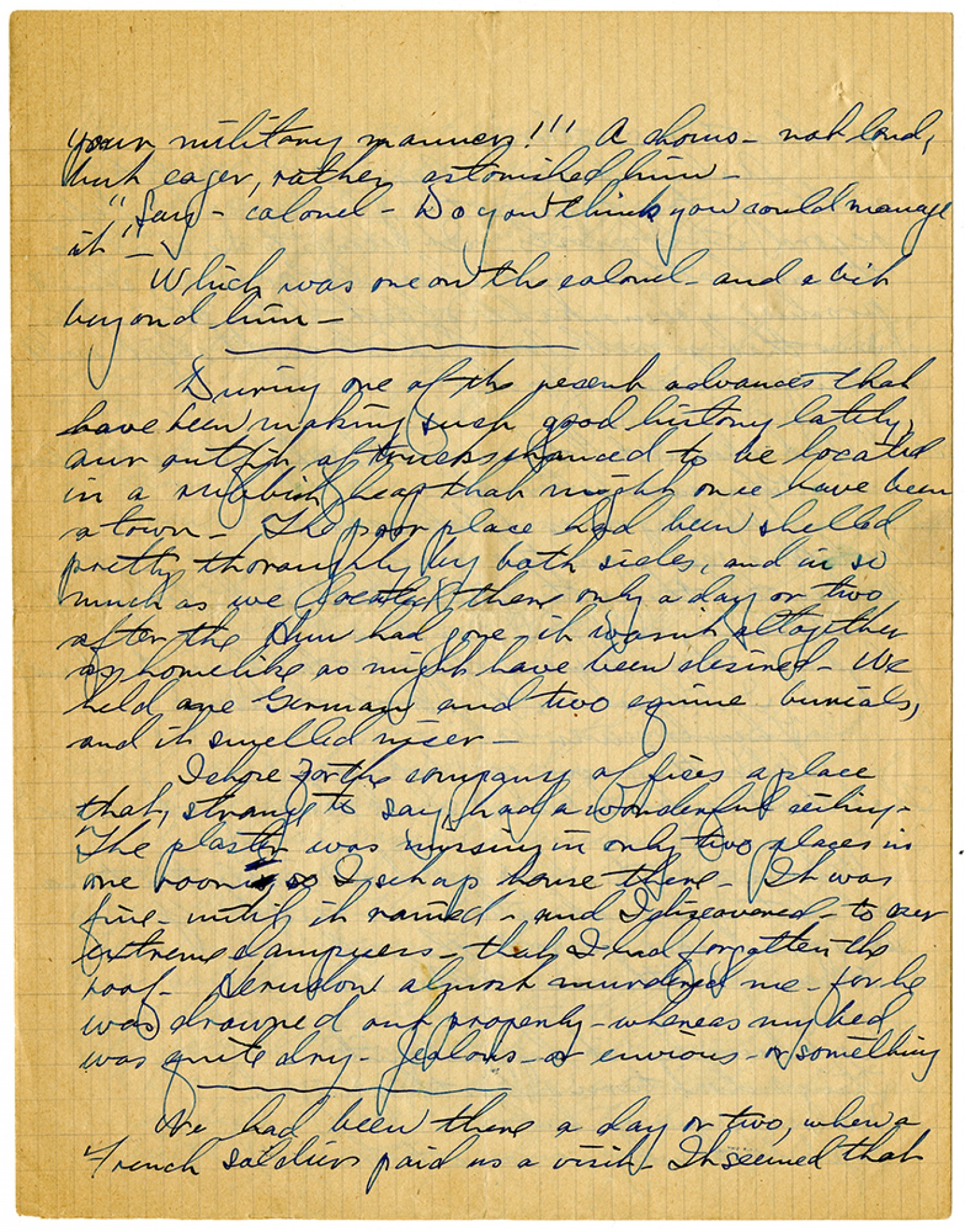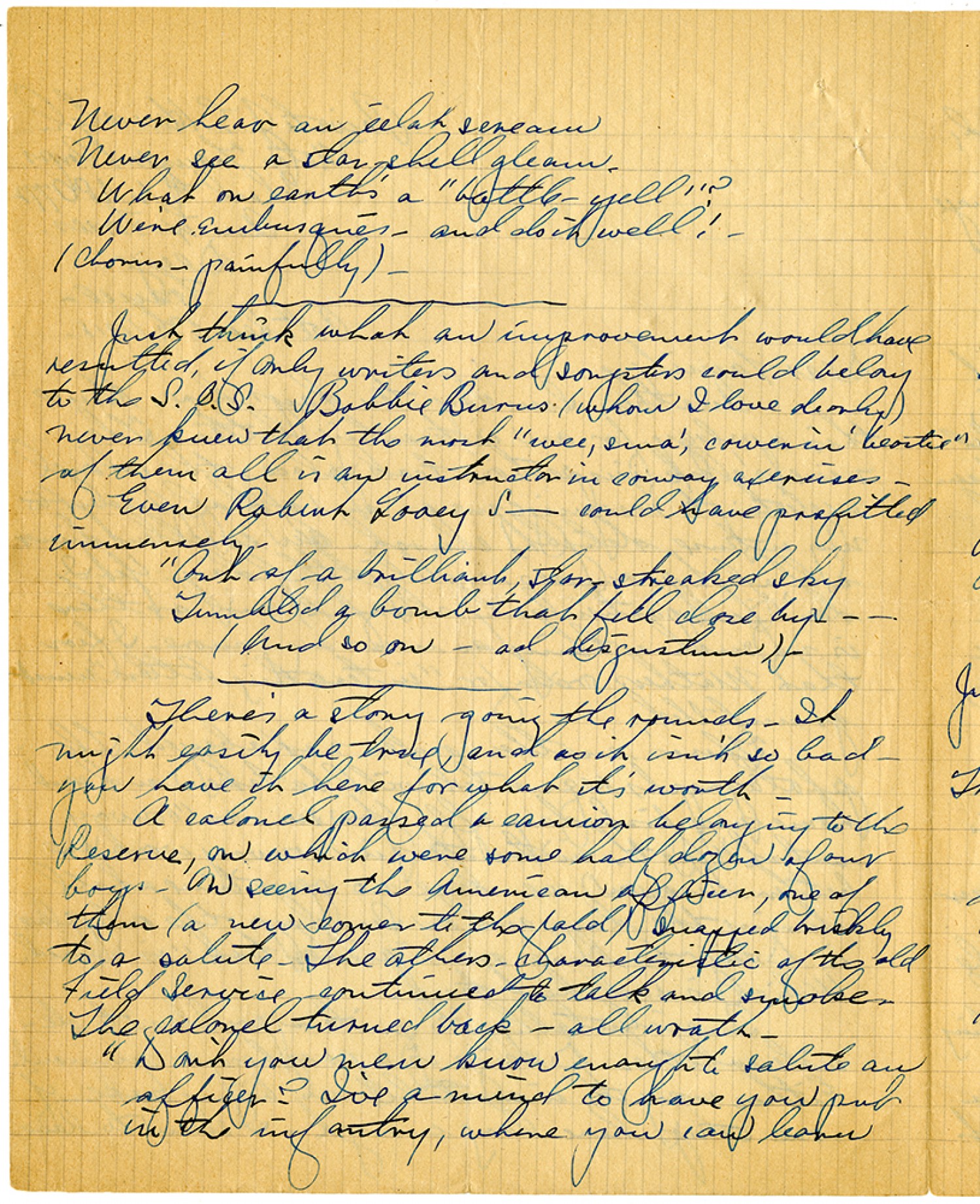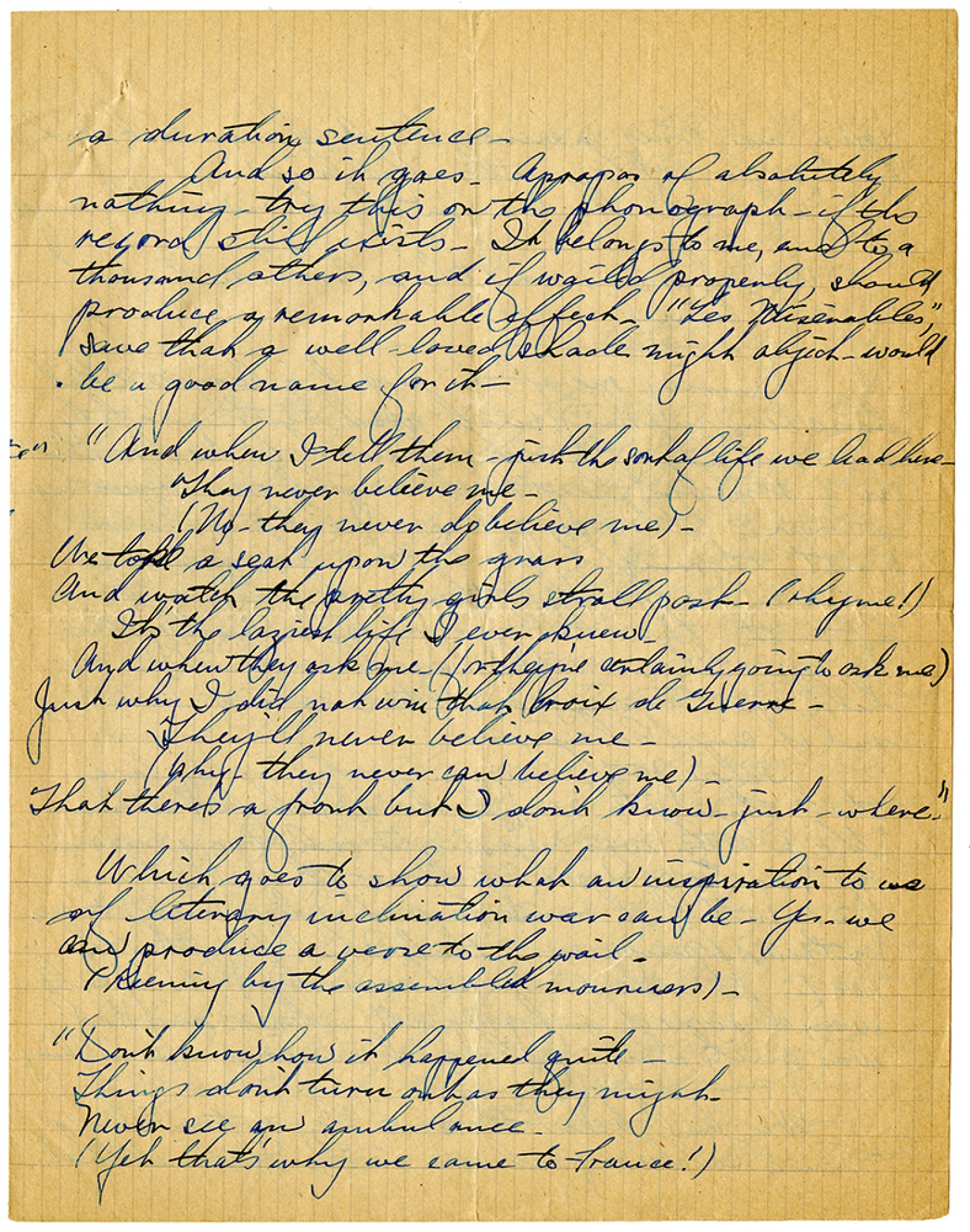 a duration sentence. And so it goes. Apropos of absolutely nothing - try this on the phonograph - if the record still exists. It belongs to me, and to a tousand others, and if wailed properly, should produce a remarkable effect. "Les Miserables", save that a well-loved shade might object - would be a good name for it. "And when I tell them - just the sort of life we had here - They never believe me. (No - they never do believe me). We took a set upon the grass and watch the pretty girls stroll past (rhyme!) It's the laziest life I ever knew - And when they ask me (for they're certainly going to ask me) Just why I did not win that Croix de Guerre - They’ll never believe me - (why - they never can believe me) - That there's a front but I don't know - just - where." Which goes to show what an inspiration to us of literary inclination war can be. Yes - we can produce a verse to the wail. (Kenny by the assembled monsieurs). "Don't know how it happened quite - Things don't turn out as they might. Never see an ambulance - (Yet that's why we came to France!)