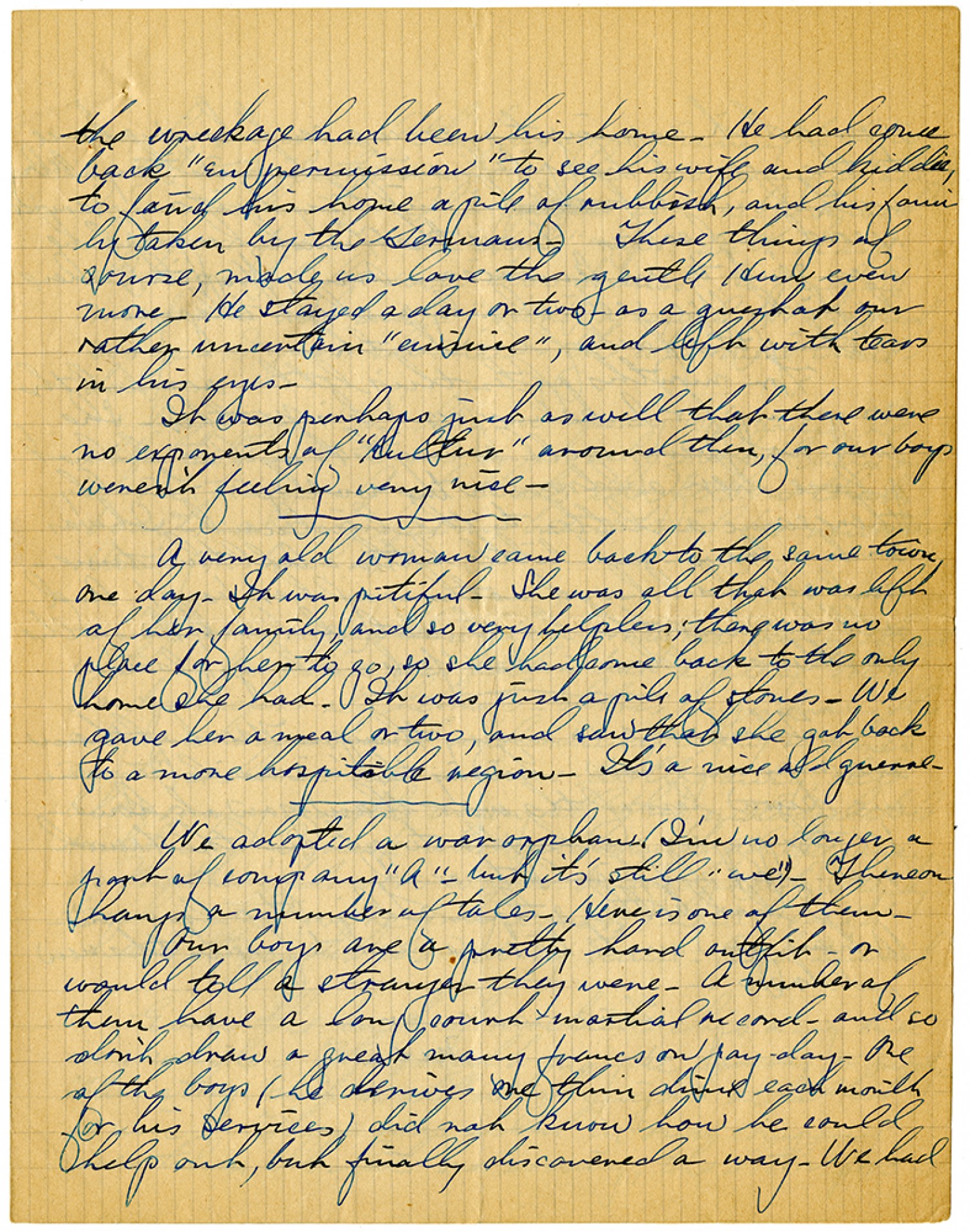 the wreckage had been his home. He had come back "En permission" to see his wife and kiddie, to find his house a pile of rubbish, and his family taken by the Germans. These things of course, made us love the gentle Hun even more. He stayed a day or two - as a guest at our rather uncertain "[ms illegible: 1 wd]", and left with tears in his eyes. It was perhaps just as well that there were no exponents of "Kultur" around then, for our boys weren't feeling very nice. A very old woman came back to the same town one day. It was pitiful. She was all that was left of her family, and so very helpless; there was no place for her to go, so she had come back to the only home she had. It was just a pile of stones. We gave her a meal or two, and saw that she got back to a more hospitable region. It's a nice old guerre. We adopted a war orphan (I'm no longer a part of company "A" - but it's still we"). Thereon hangs a number of tales. Here is one of them. Our boys are a pretty hard outfit - or would tell a stranger they were. A number of them have a long court martial record - and so don't draw a great many francs on pay-day. One of the boys (he drives one thin dime each month for his services) did not know how he could help out, but finally discovered a way. We had