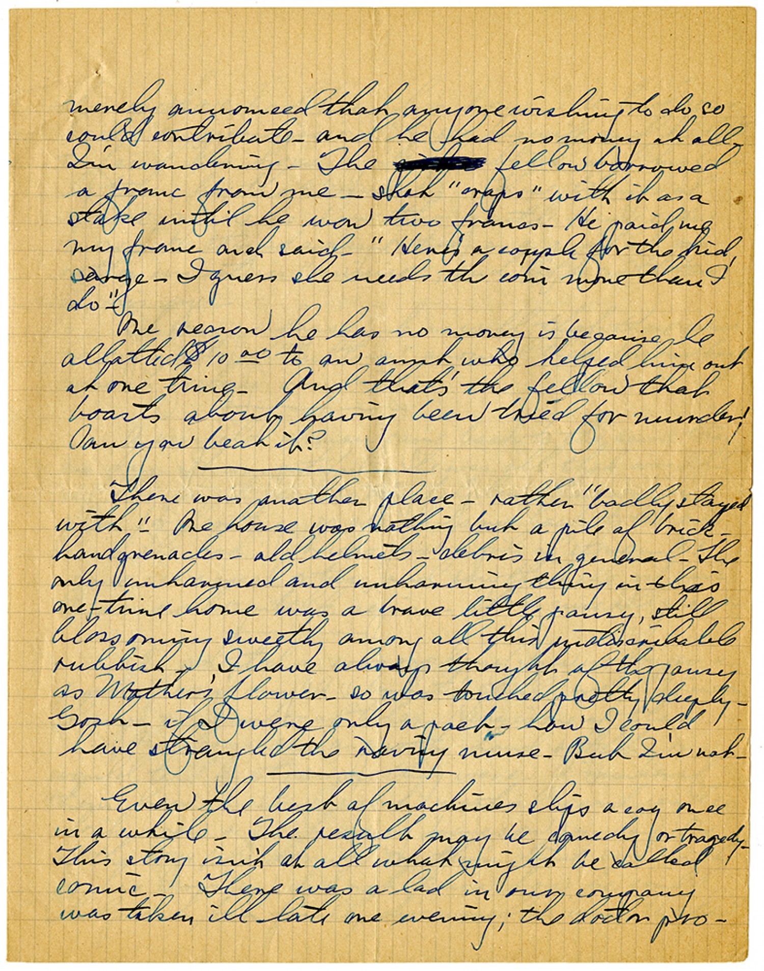 merely announced that anyone wishing to do so could contribute - and he had no money at all. I'm wondering - The fellow borrowed a franc from me - shot "craps" with it as a stake until he won two francs. He paid me my franc and said - "Here's a couple for the kid, serge. I guess she needs the coin more than I do". One reason he has no money is because he allotted $10.00 to an aunt who helped him out at one time. And that's the fellow that boasts about having been tried for murder! Can you beat it? There was another place - rather "badly stayed with". One house was nothing but a pile of brick - hand grenades - old helmets - debris in general. The only unharmed and unharming thing in this one-time home was a brave little pansy still blossoming sweetly among all this undiscribably rubbish. I have always thought of the pansy as Mother's flower - so was touched pretty deeply. Gosh - if I were only a pact - how I could have strangled the raving muse - But I'm not. Even the best of machines ships a cog once in a while. The result may be comedy or tragedy. This story isn't at all what might be called comic. There was a lad in our company was taken ill late one evening; the doctor pro-