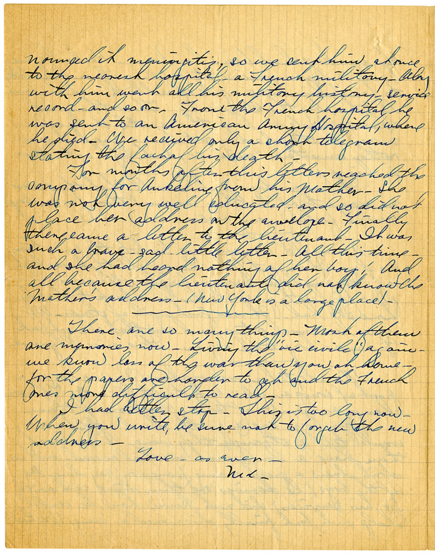 nounced it meningitis, so we sent him at once to the nearest hospital - a French military. Along with him went all his military history - service record - and so on. From the French hospital he was sent to an American Army Hospital, where he died. We received only a short telegram stating the fact of his death. For months after this letter reached the company for Ankeline from his Mother. She was not very well educated - and so did not place her address on the envelope. Finally there came a letter to the lieutenant. It was such a brave - sad - little letter. All this time - and she had heard nothing of her boy; And all because the lieutenant did not know the Mother's address. (New York is a large place). There are so many things. Most of them are memories now. Living the "vie civile" again - we know less of the war than you at home - for the papers are harder to get and the French ones more difficult to read. I had better stop. This is too long now. When you write, be sure not to forget the new address. Love - as ever- Ned.