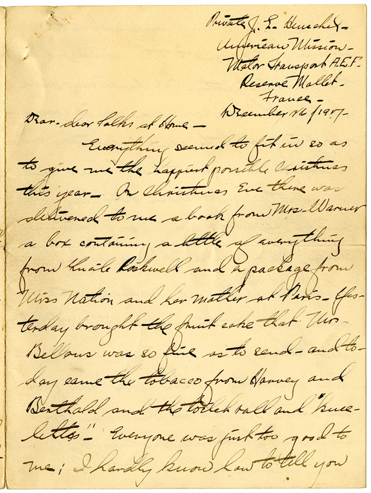 Private J.E. Henschel - American Mission - Motor Transport A.E.F. Reserve Mallet - France - December 26/1917 - Dear - dear Folks at home - Everything seemed to fit in so as to give me the happiest possible Christmas this year. On Christmas Eve there was delivered to me a book from Mrs. Warner a box containing a little of everything from Lucile Rockwell and a package from Miss Nation and her mother at Paris. Yesterday brought the fruit cake that Mrs. Bellows was so fine as to send - and today came the tobacco from Harvey and Berthold and the toilet roll and knee-letts". Everyone was just too good to me; I hardly know how to tell you
