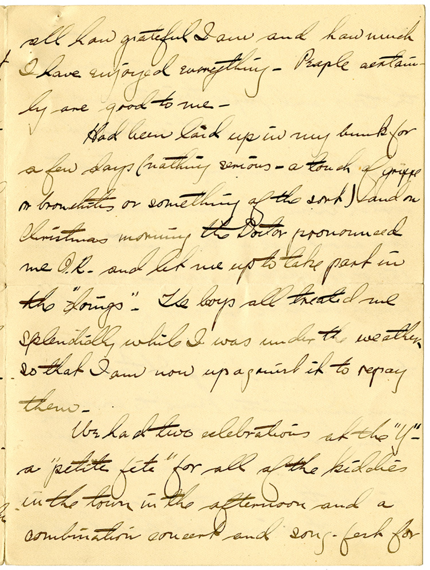 all how grateful I am and how much I have enjoyed everything. People certainly are good to me. Had been laid up in my bunk for a few days (nothing serious - a touch of grippe or bronchitis or something of the sort) and on Christmas morning the Doctor pronounced me O.K. and let me up to take part in the "doings". The boys all treated me splendidly while I was under the weather - so that I am now up against is to repay them. We had two celebrations at the "Y" - a "petite fete" for all of the kiddies in the town in the afternoon and a combination convert and song-fest for