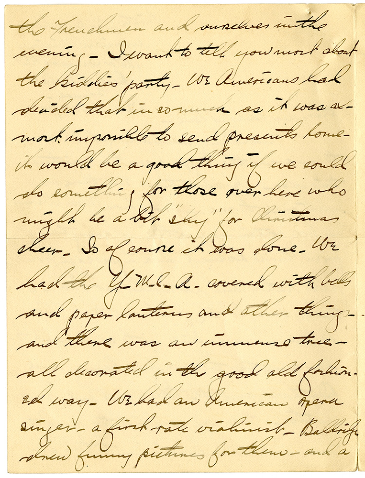 the Frenchmen and ourselves in the evening. I want to tell you most about the kiddies' party. We Americans had decided that in so much as it was almost impossible to send presents home - it would be a good thing if we could do something for those over here who might be a bit "shy" for Christmas cheer. So of course it was done. We had the Y.M.C.A. covered with bells and paper lanterns and other things - and there was an immense tree all decorated in the good old fashioned way. We had an American opera singer - a first-rate violinist - Baldrige drew funny pictures for them - and a