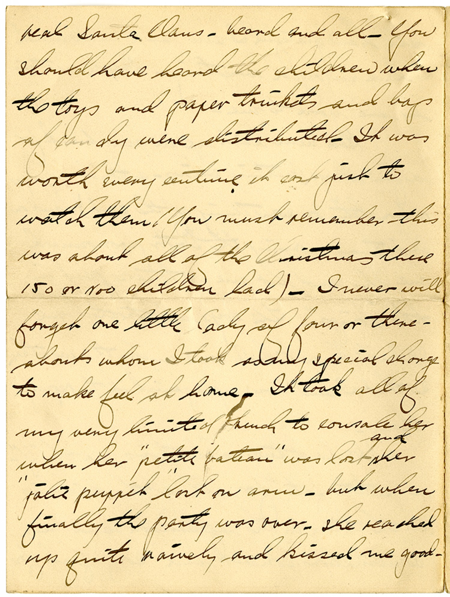 real Santa Claus - beard and all. You should have heard the children when the toys and paper trinkets and bags of candy were distributed. It was worth every centime it cost just to watch them (You must remember this was about all of the Christmas these 150 or 200 children had). I never will forget one little lady of four or thereabouts whom I took as my special charge to make feel at home. It took all of my very limited French to console her when her "petite bateau" was lost, her "jalie puppet" lost an arm - but when finally the party was over - she reached up quite naively and kissed me good.