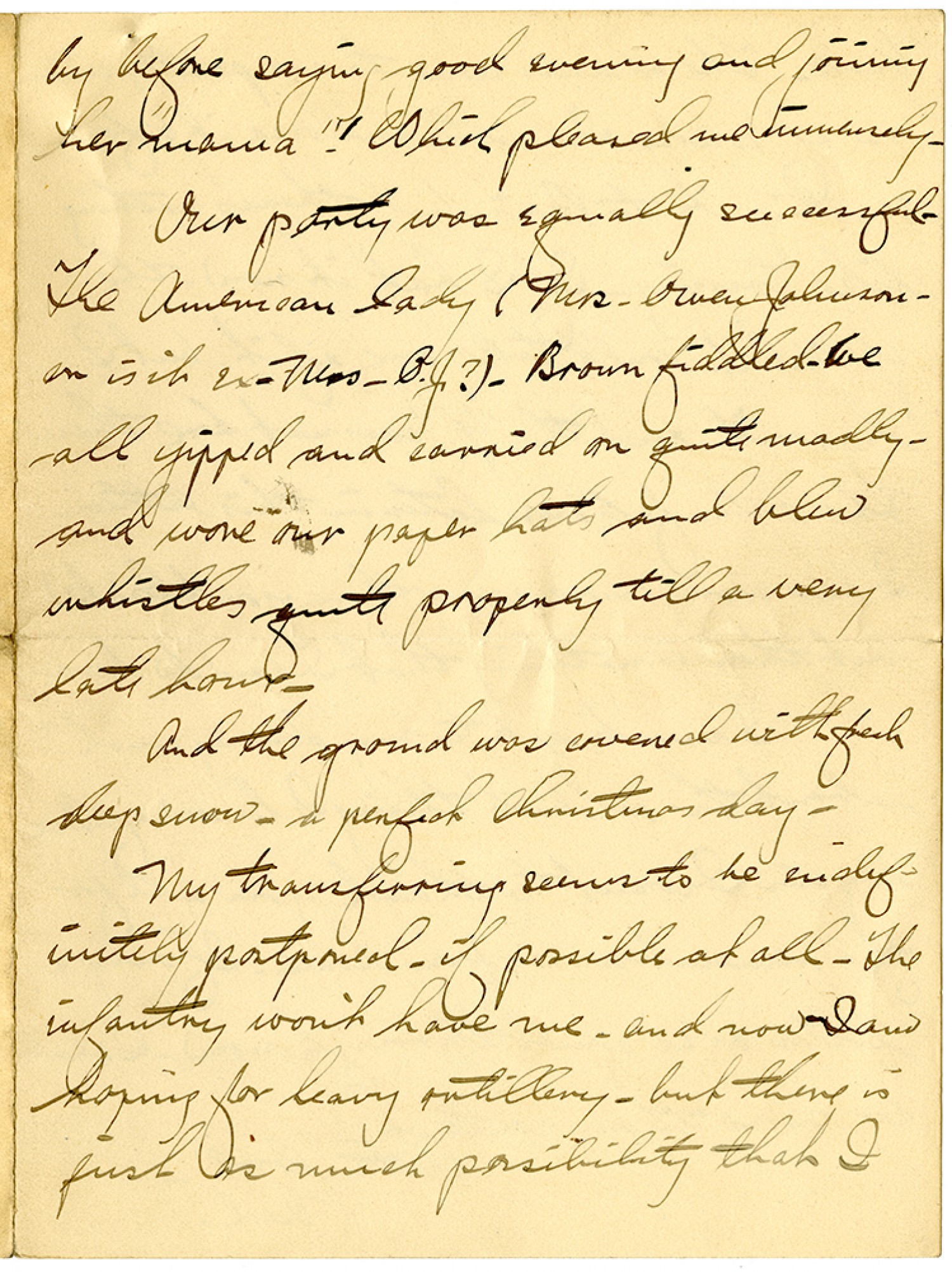 by before saying good evening and joining her "mama"! Which pleased me immensely. Our party was equally successful. The American lady (Mrs. Owen Johnson - or is it ex-Mrs. O.J?) - Brown fiddled (we all yipped and carried on quite madly - and wore our paper hats and blew whistles quite properly till a very late hour. And the ground was covered with fresh deep snow - a perfect Christmas day. My transferring seems to be indefinitely postponed - if possible at all. The infantry won't have me - and now I am hoping for heavy artillery - but there is just as much possibility that I