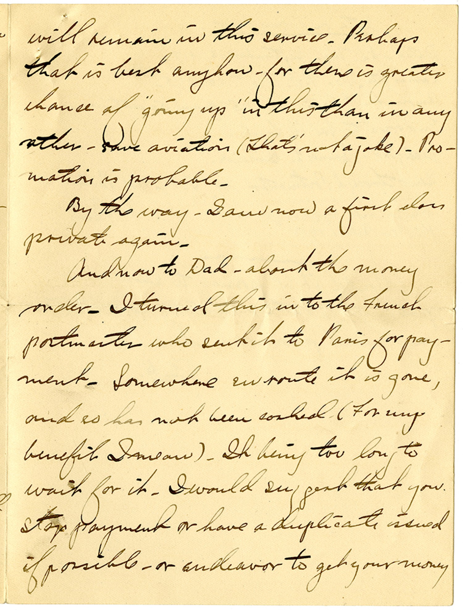 will remain in this service. Perhaps that is best anyhow - for there is greater chance of "going up" in this than in any rather - save aviation (That's not a joke). Promotion is probable. By the way - I am now a first class private again. And now to Dad - about the money order. I turned this in to the French postmaster who sent it to Paris for payment. Somewhere en route it is gone, and so has not been cashed (For my benefit I mean). It being too long to wait for it - I would suggest that you stop payment or have a duplicate issued if possible - or endeavor to get your money