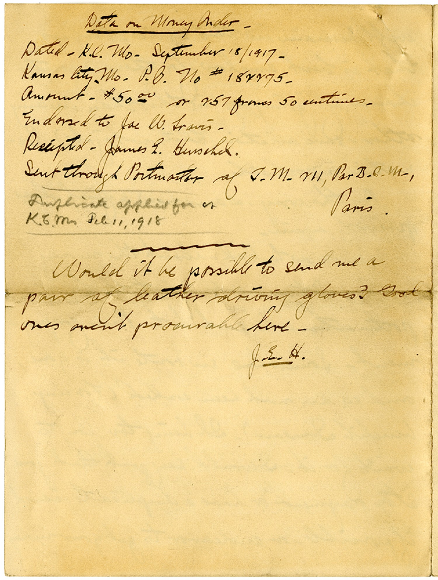 Data on Money Order - Dated - [Kansas City, Missouri] - September 18/1917 - Kansas City, [Missouri] P.O. No #182275 - Amount - $50.00 or 257 francs centimes - Endorsed to Joe W. Travis - Receipted - James E. Henschel - Sent through Postmaster of T.M.M, Par B.C.M., Paris. Duplicate applied for at [Kansas City] [Missouri] [February] 11, 1918 Would it possible to send me a pair of leather driving gloves? Good ones aren't procurable here. J.E.H.