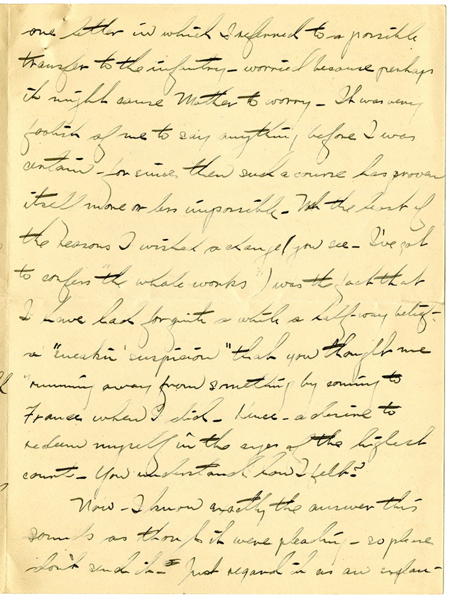 one letter in which I referred to a possible transfer to the infantry - worried because perhaps is might cause Mother to worry. It was very foolish of me to say anything before I was certain - for since then such a course has proven itself more or less impossible. Not the least of the reasons I wished a change (you see - I've got to confess "the whole works") was the fact that I have had for quite a while a half-way belief - a "sneakin' suspicion" that you thought me "running away from something" by coming to France when I did. Hence - a desire to redeem myself in the eyes of the highest courts. You understand how I felt? Now - I know exactly the answer this sounds as though it were pleading - so please don't send it. Just regard it as an explan-