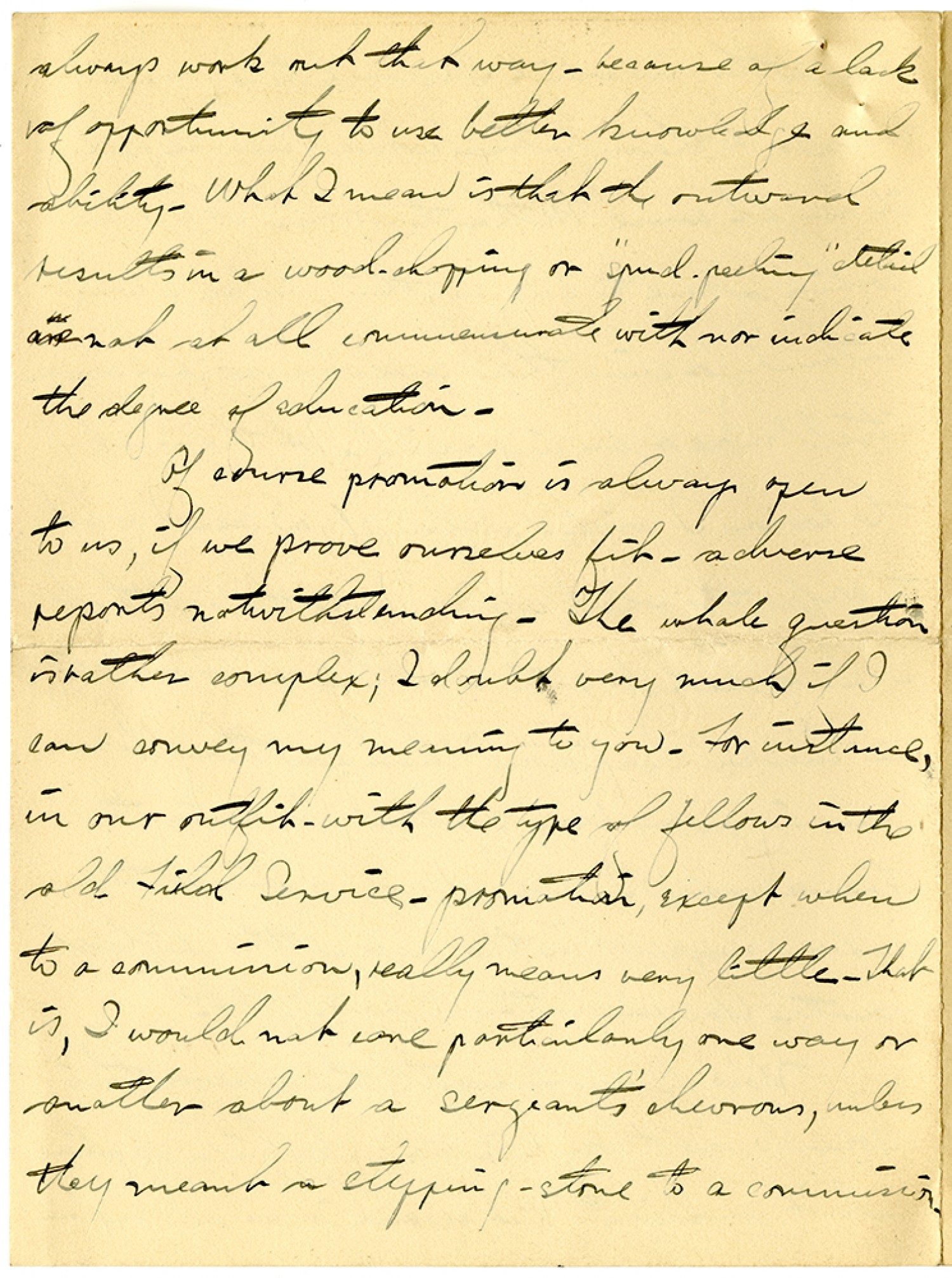 always work out that way - because of a lack of opportunity to use better knowledge and ability. What I mean is that the outward results in a wood-chopping or "spud-peeling" detail are not at all commemorate with nor indicate the degree of education. Of course promotion is always open to us, if we prove ourselves fit - adverse reports notwithstanding. The whole question is rather complex; I doubt very much if I can convey my meaning to you. For instance, in our outfit - with the type of fellows in the old Field Service - promotion, except when to a commission, really means very little. That is, I would not care particularly one way or another about a sergeants' chevrons, unless they meant a stepping-stone to a commission.