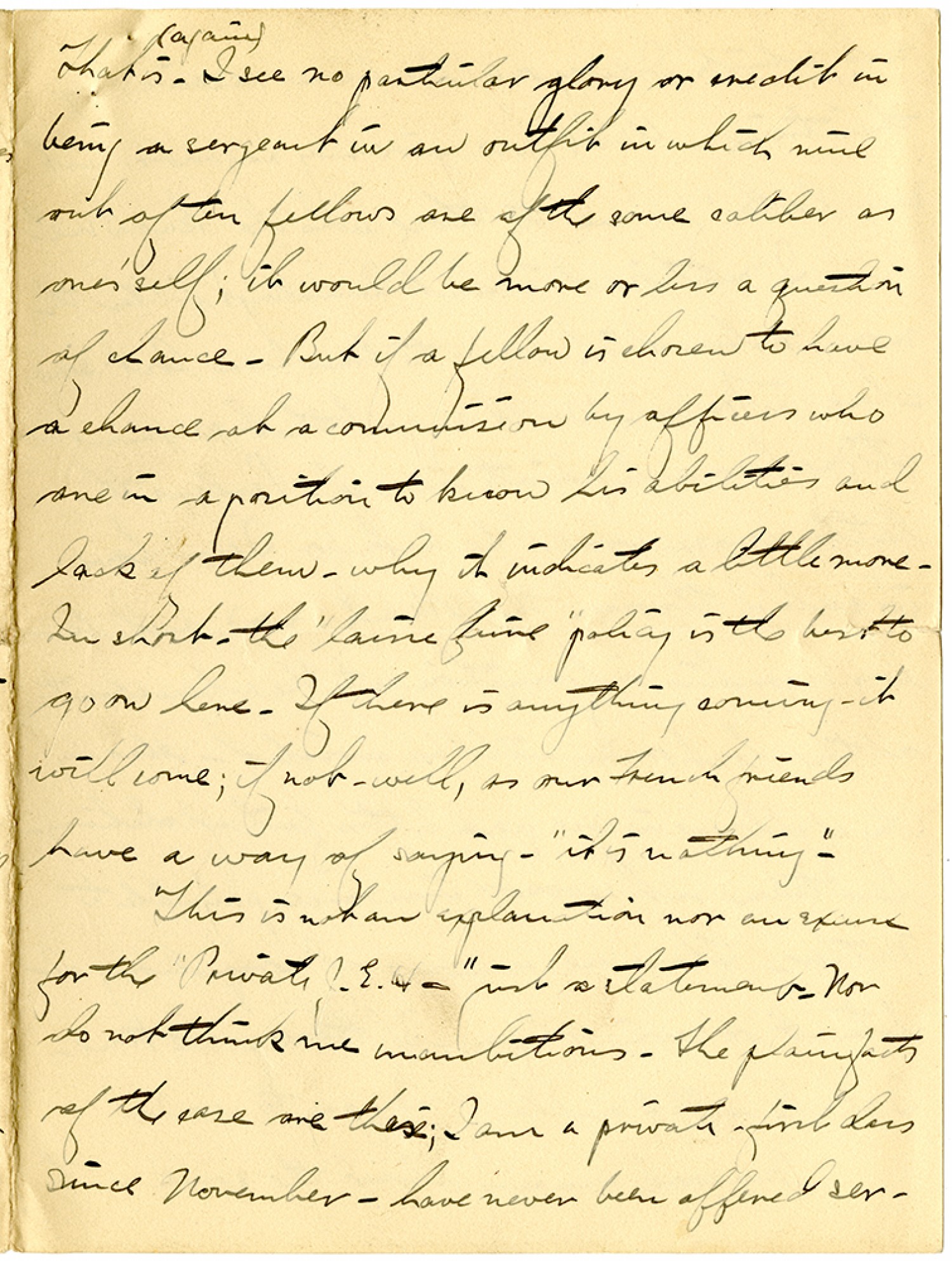 That is (again) I see no particular glory or credit in being a sergeant in an outfit in which nine out of ten fellows are of the same caliber as one's self; it would be more or less a question of chance. But if a fellow is chosen to have a chance at a commission by officers who are in a position to know his abilities and lack of them - why it indicates a little more. In short - the "laine faine" policy is the best to go on here. If there is anything coming - it will come; if not - well, as our French friends have a way of saying - "it's nothing". This is not an explanation nor an excuse for the "Private J.E.H.-" just a statement. Now do not think me unambitious. The plain facts of the case are these; I am a private-first class since November - have been offered ser-