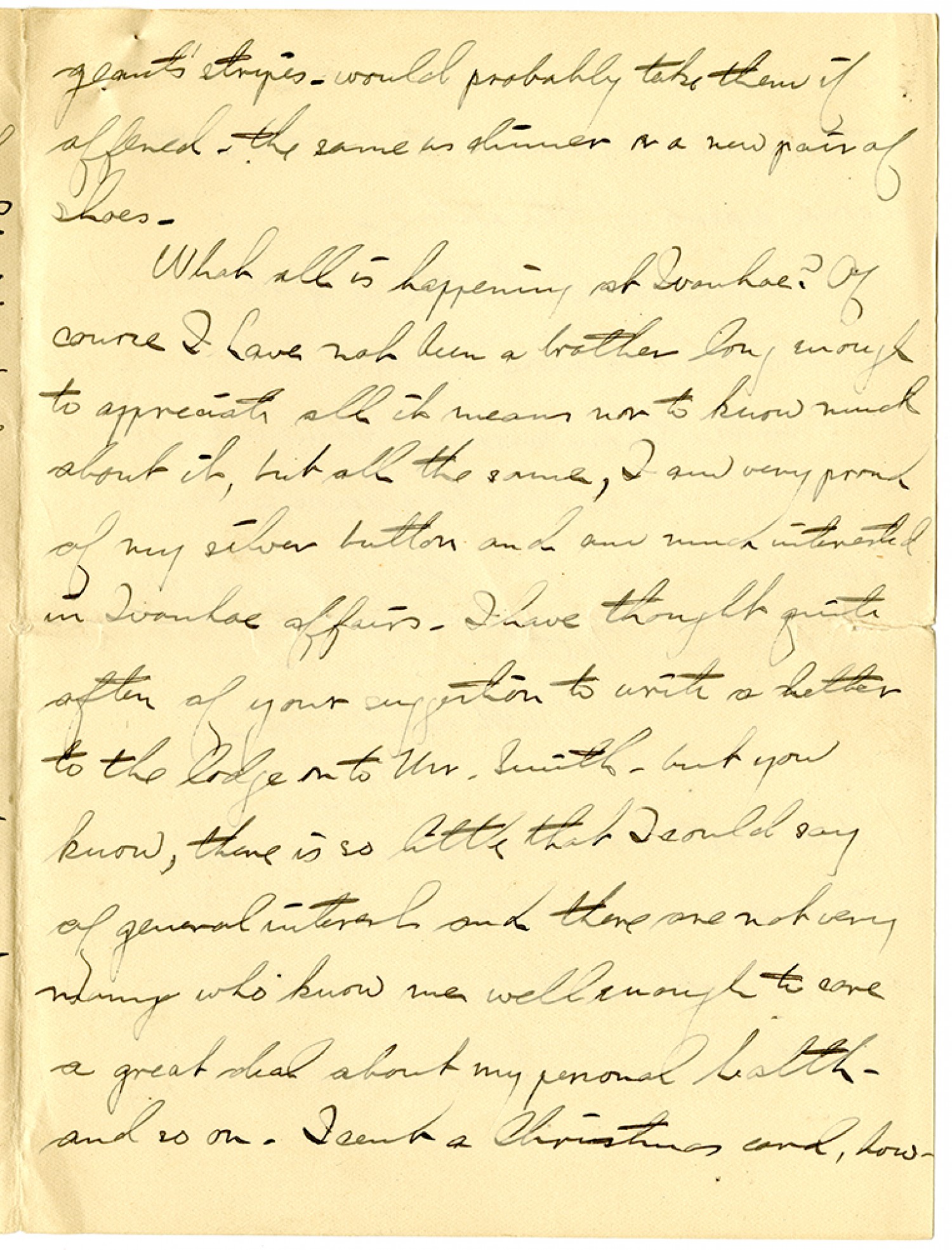 geants' stripes - would probably take them if offered - the same as dinner or a new pair of shoes. What all is happening at Ivanhoe? Of course I have not been a brother long enough to appreciate all it means nor to know much about it, but all the same, I am very proud of my silver button and am much interested in Ivanhoe affairs. I have thought quite often of your suggestion to write a letter to the lodge or to Mr. Smith - but you know, there is so little that I could say of general interest and there are not very many who know me well enough to care a great deal about my personal health - and so on. I sent a Christmas card, how-