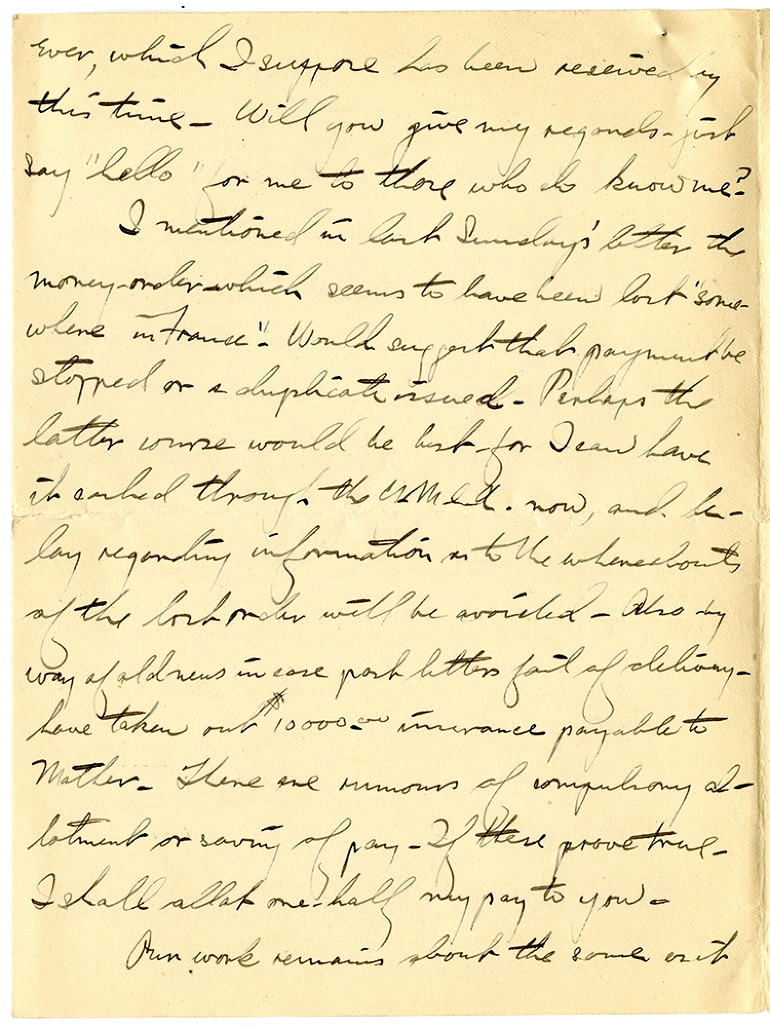 ever, which I suppose has been received by this time. Will you give my regards - just say "hello" for me to those who do know me? I mentioned in last Sunday's letter the money-order - which seems to have been lost "somewhere in France". Would suggest that payment be stopped or a duplicate issued. Perhaps the latter course would be best for I can have it cashed through the Y.M.C.A. now, and delay regarding information as to the whereabouts of the lost order will be avoided. Also by way of old news in case past letters fail of delivery - have taken out $10000.00 insurance payable to Mother. There are rumors of compulsory allotment or saving of pay. If these prove true - I shall allot one-half my pay to you. Our work remains about the same as it