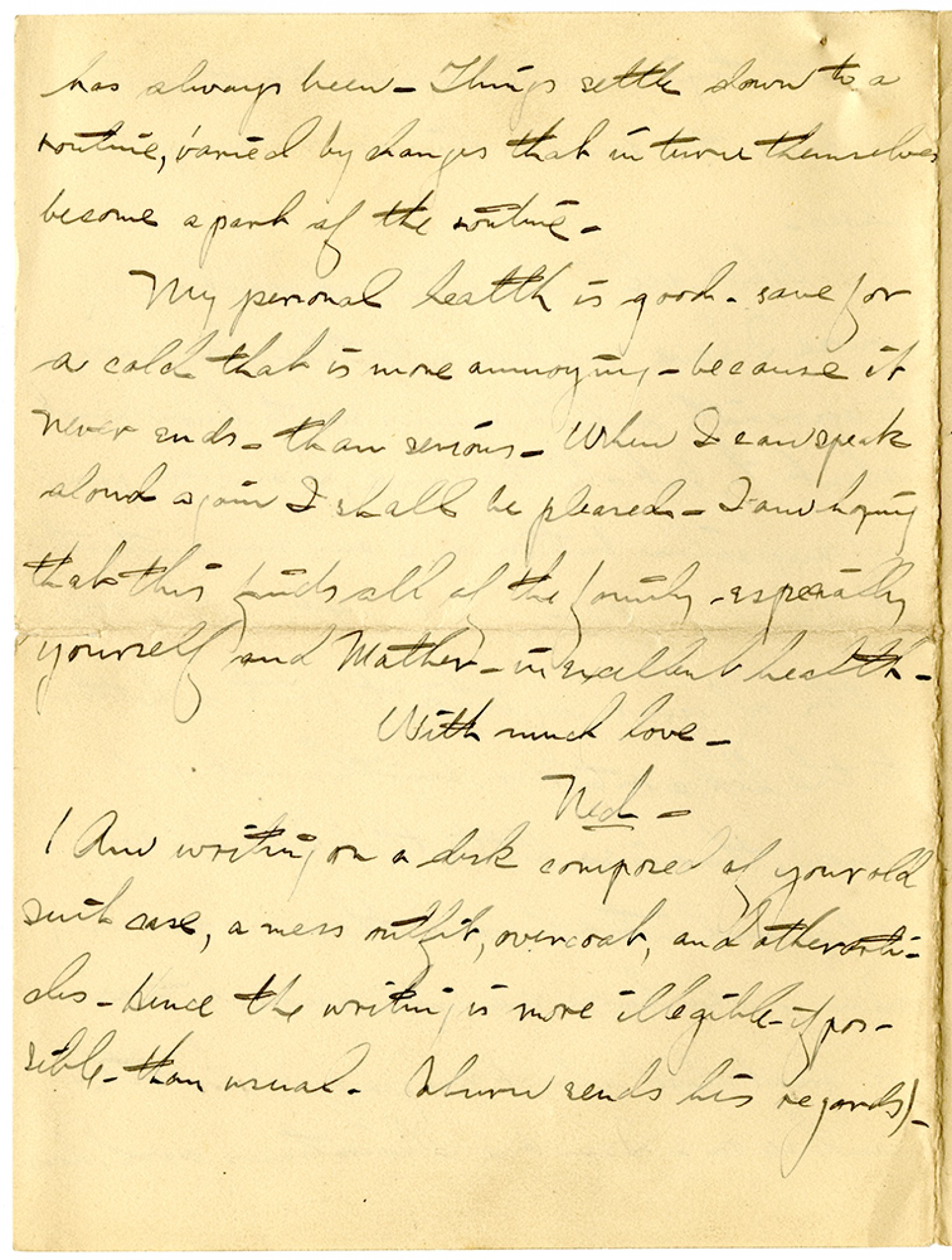 has always been. Things settle down to a routine, varied by changes that in turn themselves become a part of the routine. My personal health is good - save for a cold that is more annoying - because it never ends - than serious. When I can speak aloud again I shall be pleased. I am hoping that this finds all of the family - especially yourself and Mother - in excellent health. With much love - Ned - (I am writing on a desk composed of your old suit case, a mess outfit, overcoat, and other articles. Hence the writing is more illegible - if possible - than usual. Coburn sends his regards).