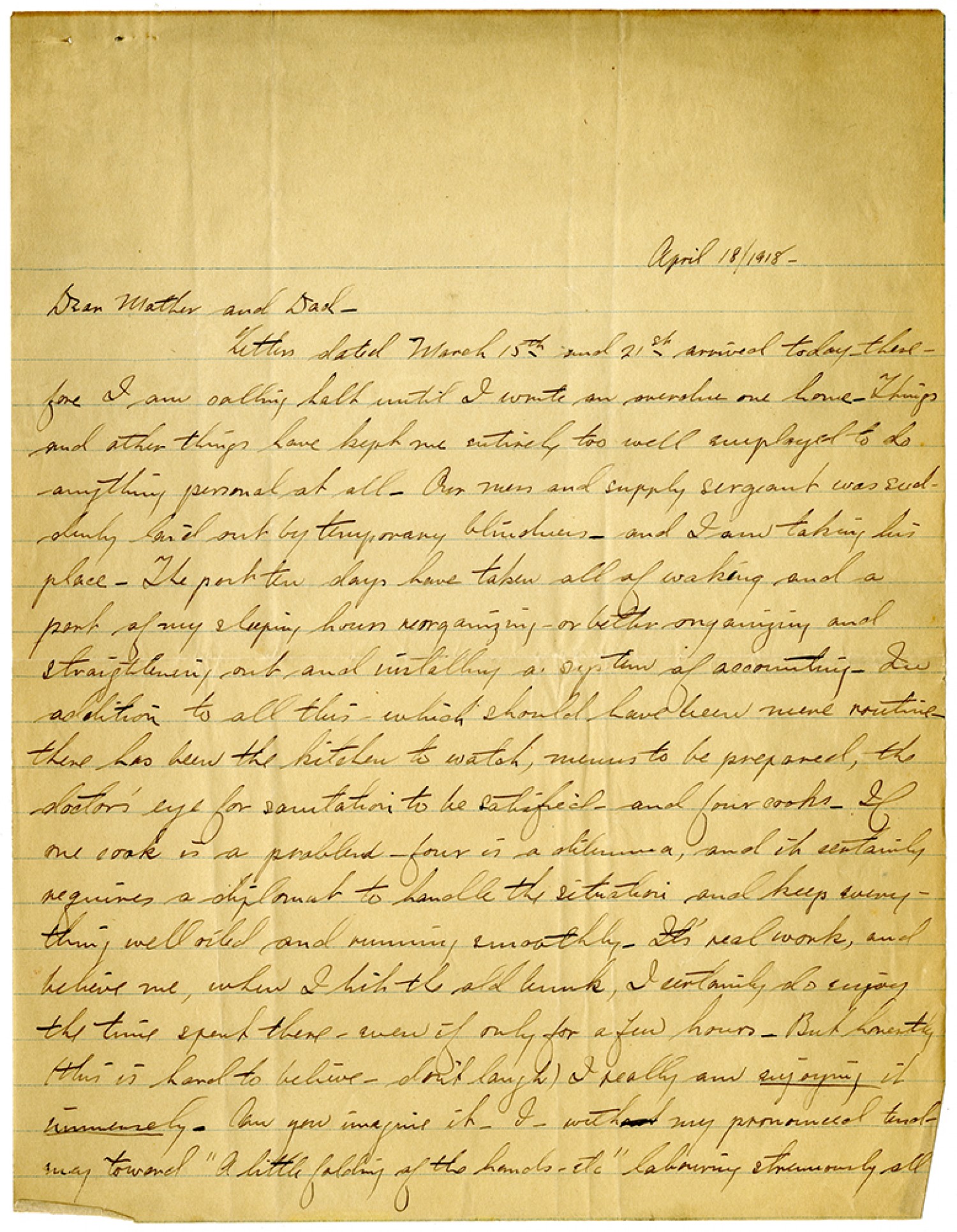 April 18/1918 - Dear Mother and Dad - Letters dated March 15th and 21st arrived today - therefore I am calling halt until I write an overdue one home. Things and other things have kept me entirely too well employed to do anything personal at all. Our men and supply sergeant was suddenly laid out by temporary blindness - and I am taking his place. The past ten days have taken all of waking and a part of my sleeping hours reorganizing - or better organizing and straightening out, and installing a system of accounting. In addition to all this - which should have been mere routine - there has been the kitchen to watch, menus to be prepared, the doctors' eye for sanitation to be satisfied - and four cooks. If one cook is a problem - four is a dilemma, and it certainly requires a diplomat to handle the situation and keep everything well oiled and running smoothly. It's real work, and believe me, when I hit the old bunk, I certainly do enjoy the time spent there - even if only for a few hours. But honestly (this is hard to believe - don't laugh) I really am enjoying it immensely. Can you imagine it. I - with my pronounced tendency toward "A little folding of the hands - etc" labouring strenuously all