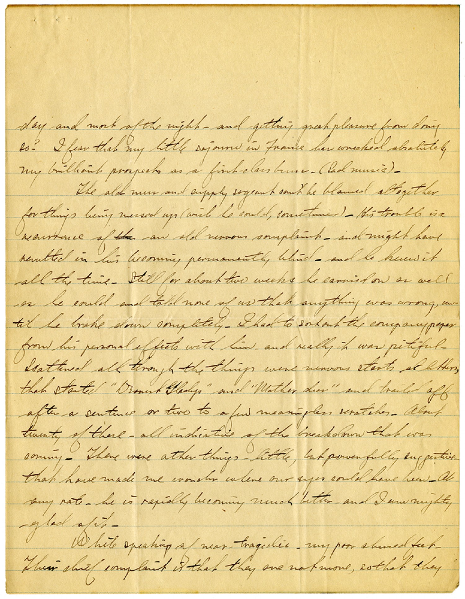 day and most of the night - and getting great pleasure from doing so? I fear that my little sojourn in France has wrecked absolutely my brilliant prospects as a first-class bum - (Sad music). The old mess and supply sergeant could be blamed altogether for things being messed up (wish he could, sometimes). His trouble is a recurrence of an old nervous complaint - and might have resulted in his becoming permanently blind - and he knew it all the time. Still for about two weeks he carried on as well as he could and told none of us that anything was wrong, until he broke down completely. I had to sort out the company paper from his personal effects with him and really it was pitiful. Scattered all through the things were nervous starts at letters, that started "Dearest Gladys" and "Mother dear" and trailed off after a sentence of two to a few meaningless scratches. About twenty of these - all indicative of the breakdown that was coming. There were other things - little, but powerfully suggestive that have made me wonder where our eyes could have been. At any rate - he is rapidly becoming much better and I am mighty glad of it. While speaking of near-tragidie - my poor abused feet. Their chief complaint is that they are not more, so that they