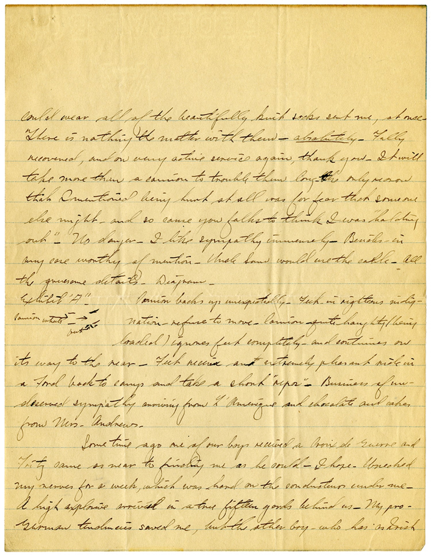 could wear all of the beautifully knit socks sent me, at once. There is nothing the matter with them - absolutely. Fully recovered, and on very active service again, thank you. It will take more than a camion to trouble them long. The only reason that I mentioned being hurt at all was for fear that someone else might - and so cause you folks to think I was "holding out". No danger. I like sympathy immensely. Besides - in an case worthy of mention - Uncle Sam would use the cable. All the gruesome details - Diagram. [diagram of accident] Exhibit "A" Camion wheels feet Camion backs up unexpectedly. Feet, in righteous indignation - refuse to move. Camion quite haughty (being loaded) ignores feet completely - and continues on its way to the rear. Feet receive an extremely pleasant ride in a Ford back to camp and take a short "repos". Business of undeserved sympathy arriving from L'Amerique and chocolate and cakes from Mrs. Andrews. Some time ago one of our boys received a Croix de Guerre and Fritz came as near to finding me as he could - I hope. Wrecked my nerves for a week, which was hard on the conducteur under me. A high explosive arrived in a tree fifteen years behind us. My pro-German tendencies saved me, but the other boy - who has as Irish