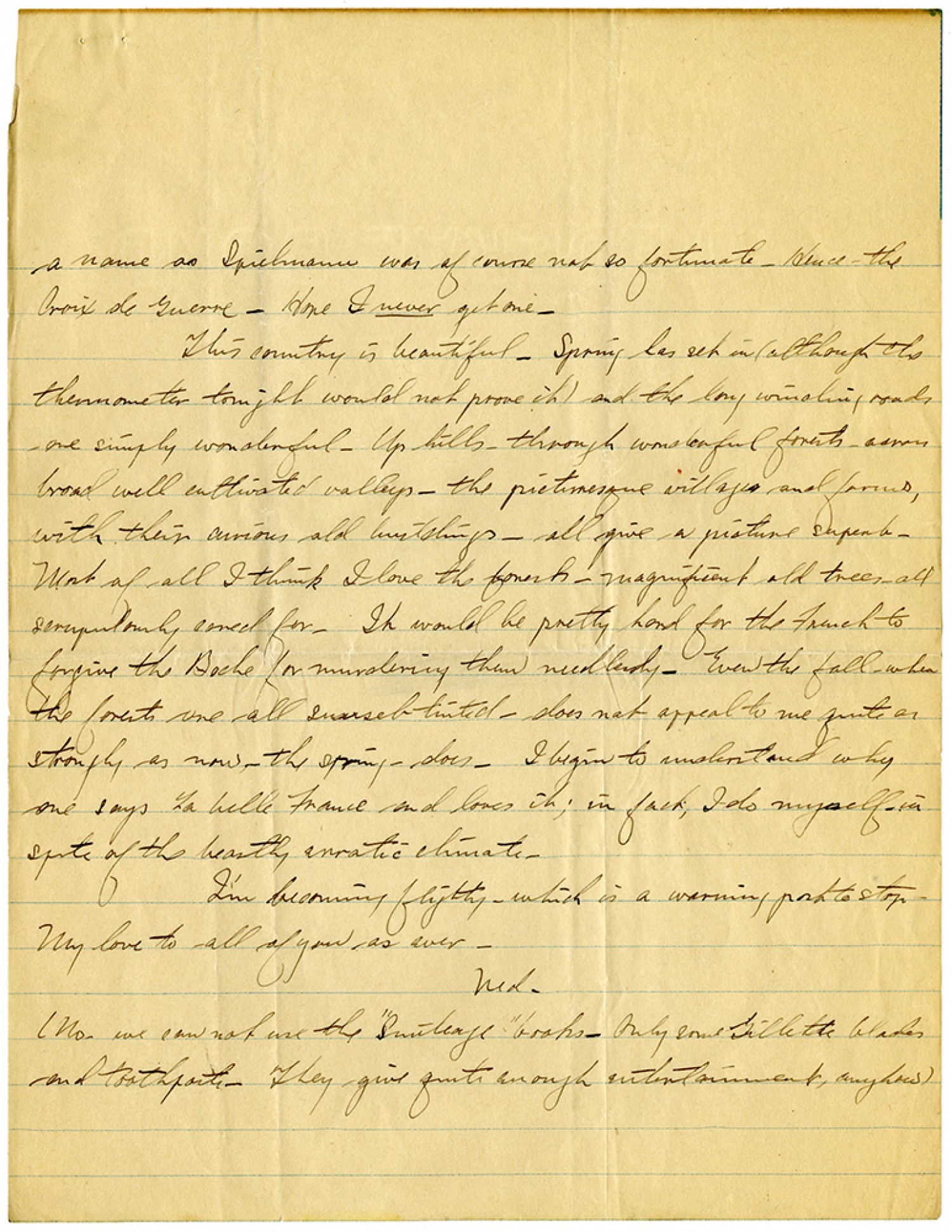 a name as Spichmann was of course not so fortunate. Hence - the Croix de Guerre. Hope I never get one. This country is beautiful. Spring has set in (although the thermometer tonight would not prove it) and the long winding roads are simply wonderful. Up hills - through wonderful forests across broad well cultivated valleys - the picturesque villages and farms, with their curious old buildings - all give a picture superb. Most of all I think I love the forest - magnificent old trees - all scrupulously cared for. It would be pretty hard for the French to forgive the Boche for murdering them needlessly. Even the fall - when the forests are all sunset-tinted - does not appeal to me quite as strongly as now - the spring does. I begin to understand why one says La belle France and loves it; in fact, I do myself - in spite of the beastly erratic climate. I'm becoming flighty - which is a warning post to stop. My love to all of you as ever. Ned. (No. we can not use the "Smileage" books. Only some Gillettte blades and toothpaste. They give quite enough entertainment, anyhow)