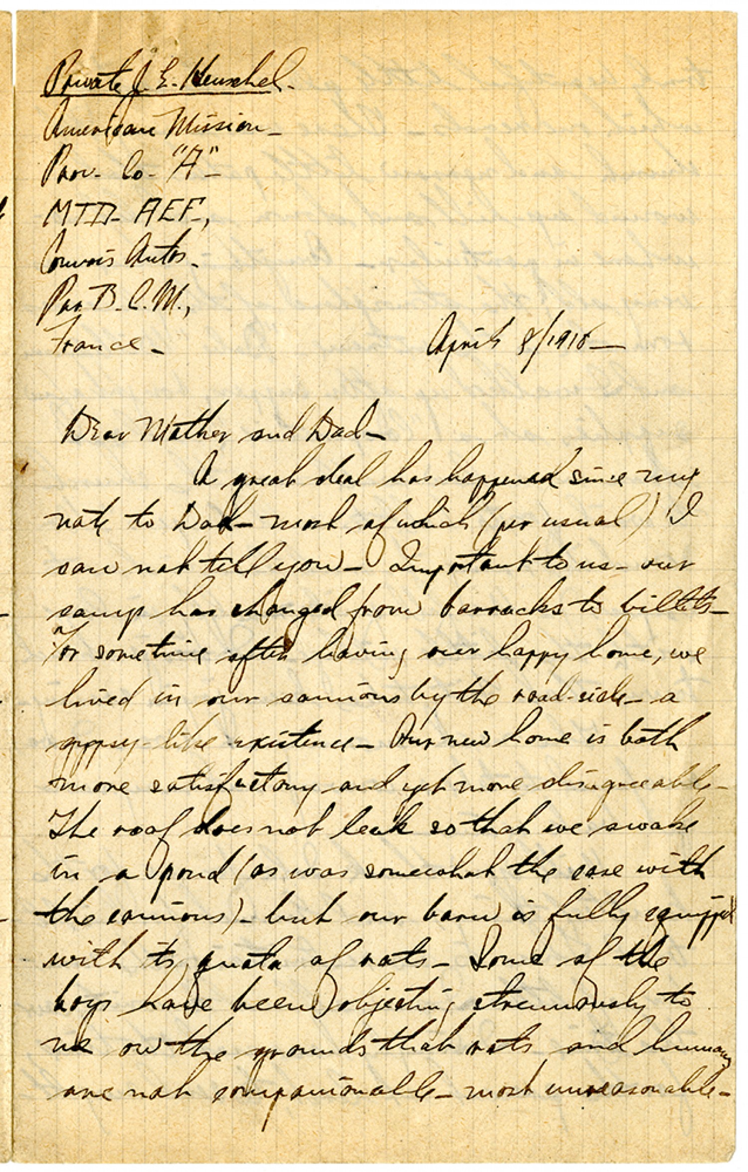 Private J.E. Henschel. American Mission. Prov. Co. "A". MTD. A.E.F., Convois Autos. Par B.C.M., France - April 8/1918 - Dear Mother and Dad - A great deal has happened since my note to Dad - most of which (per usual) I can not tell you. Important to us - our camp has changed from barracks to billets. For sometime after leaving our happy home, we lived in our camions by the road-side - a gypsy-like existence. Our new home is both more satisfactory and yet more disagreeable. The road does not leak so that we awake in a pond (as was somewhat the case with the camions) - but our barn is fully equipped with its quota of rats. Some of the boys have been objecting strenuously to me on the grounds that rats and humans are not companionable - most unreasonable -
