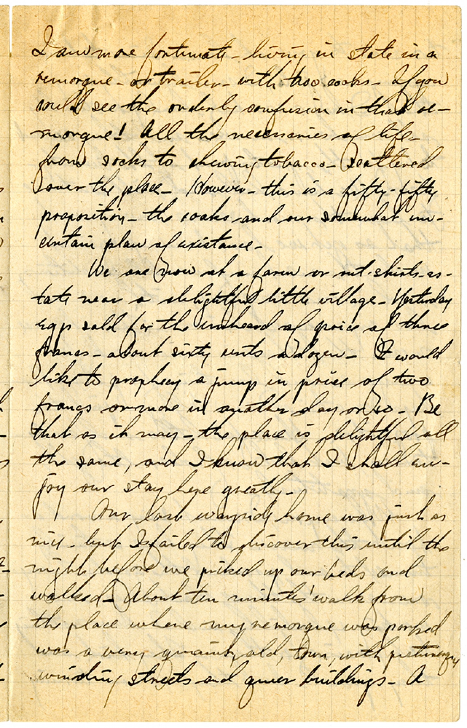 I am more fortunate - living in state in a remorque - or trailer - with two cooks. If you could see the orderly confusion in that remorque! All the necessaries of the life - from socks to chewing tobacco - scattered over the place. However - this is a fifty-fifty proposition - the cooks and our somewhat uncertain plan of existence. We are now at a farm or out-skirts - estate near a delightful little village. Yesterday eggs sold for the unheard of price of three francs - about sixty cents a dozen. I would like to prophecy a jump in price of two francs or more in another day or so. Be that as it may - the place is delightful all the same, and I know that I shall enjoy our stay here greatly. Our last wayside home was just as nill - but I failed to discover this until the night before we picked our beds and walked. About ten minutes' walk from the place where my remorque was parked as a very quaint, old, town, with picturesque winding streets and queer buildings. A