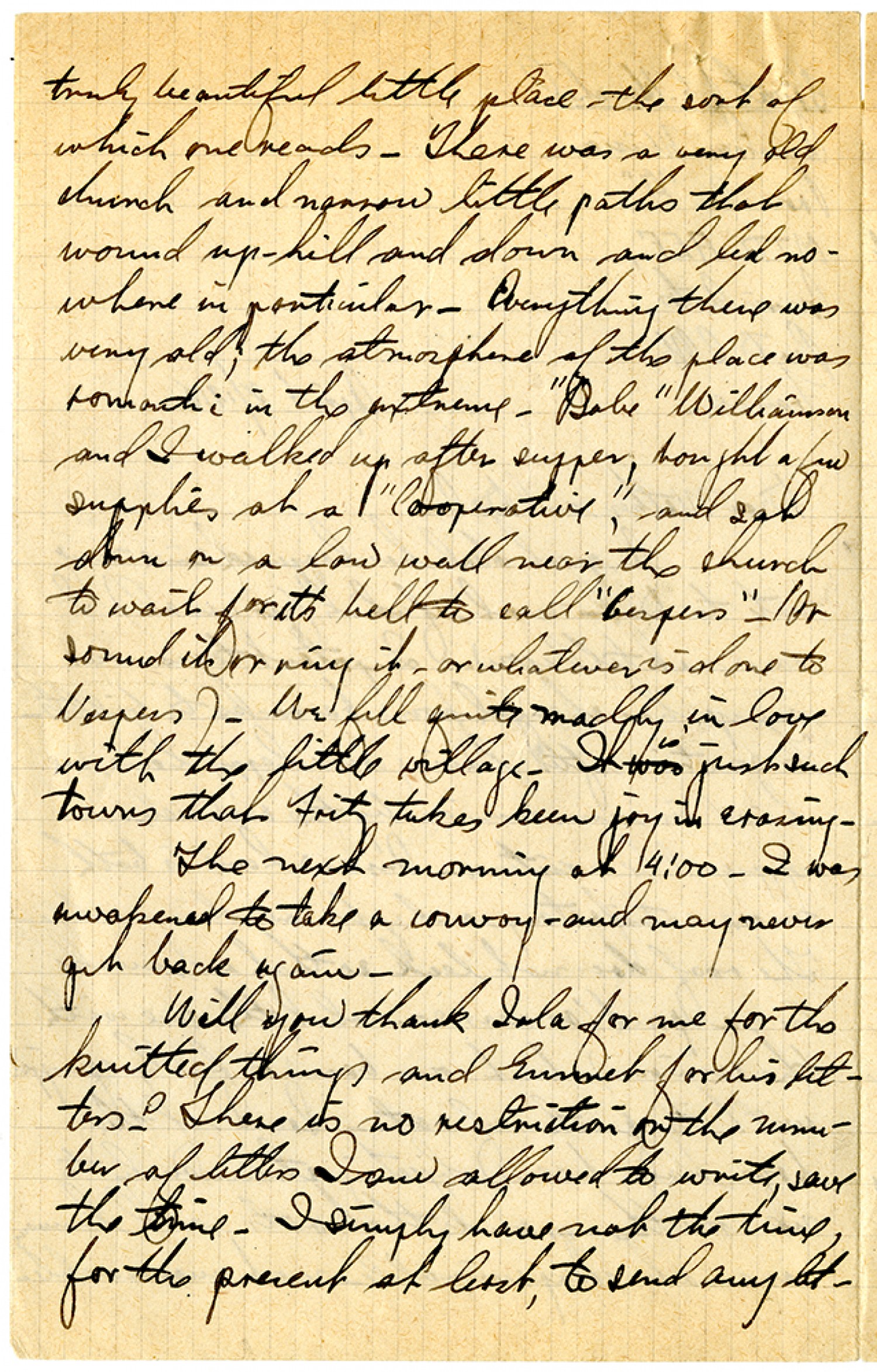 truly beautiful little place - the sort of which one reads. There was a very old church and narrow little paths that wound up-hill and down and led nowhere in particular. Everything there was very old; the atmosphere of the place was romantic in the extreme. "Babe" Williamson and I walked up after supper, bought a few supplies at a "Cooperative," and sat down on a low wall near the church to wait for it's bell to call "Vespers" - (Or sound it or ring it - or whatever is done to Vespers). We fell quite madly in love with the little village. It is just such towns that Fritz takes keen joy in erasing. The next morning at 4:00. I was awakened to take a convoy - and may never get back again. Will you thank Iola for me for the knitted things and Emmet for his letters? There is no restriction on the number of letters I am allowed to write, save the time. I simply have not the time, for the present at least, to send any let-