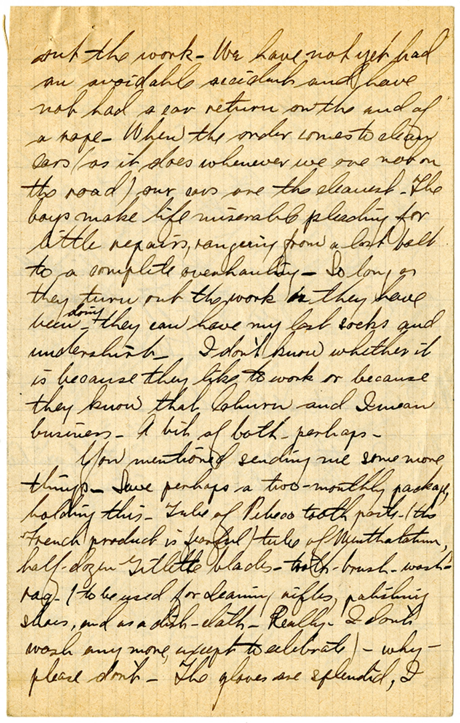 out the work. We have not yet had an avoidable accident and have not had a car return on the end of a rope. When the order comes to clean cars (as it does whenever we are not on the road) our cars are the cleanest. The boys make life miserable pleading for little repairs, ranging from a lost belt to a complete overhauling. So long as they turn out the work as they have been doing - they can have my last socks and undershirt. I don't know whether it is because they like to work or because they know that Coburn and I mean business. A bit of both - perhaps. You mentioned sending me some more things. Save perhaps a two-monthly package, holding this - Tube of Pebeco tooth paste - (the French product is fearful) tube of Mentholatum, half-dozen Gillette blades - tooth-brush - washrag - (to be used for cleaning rifles, polishing shoes, and a dish-cloth - Really - I don't wash any more, except to celebrate) - why - please don't. The gloves are splendid, I