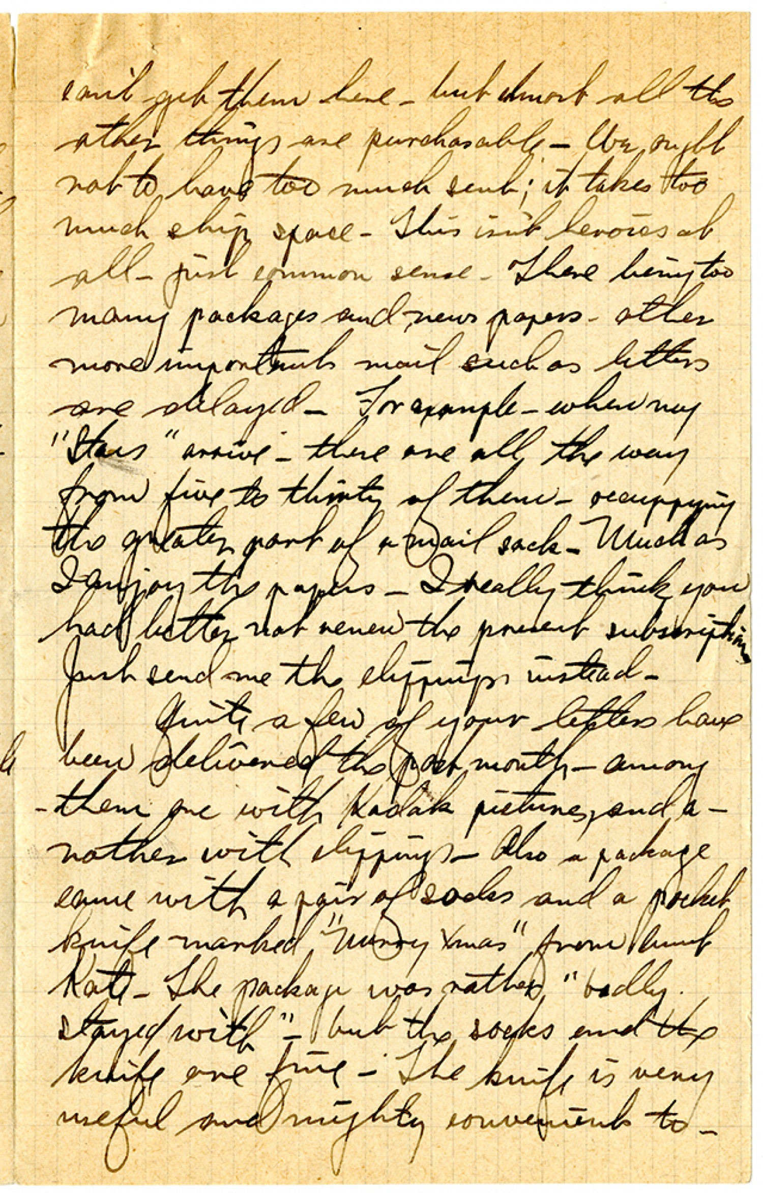 can't get them here - but almost all the other things are purchasable. We ought not to have too much sent; it takes too much ship space. This isn't heroics at all - just common sense. There being too many packages and news papers - other more important mail such as letters are delayed. For example - when my "Stars" arrive - there are all the way from five to thirty of them - occupying the greater part of a mail sack. Much as I enjoy the papers - I really think you had better not renew the present subscription. Just send me the clippings instead. Quite a few of your letters have been delivered the past month - among them one with Kodak pictures, and another with clippings. Also a package come with a pair of socks and a pocket knife marked "Merry Xmas" from Aunt Kate. The package was rather "badly stayed with" - but the socks and knife are fine. The knife is very useful and mighty convenient to -