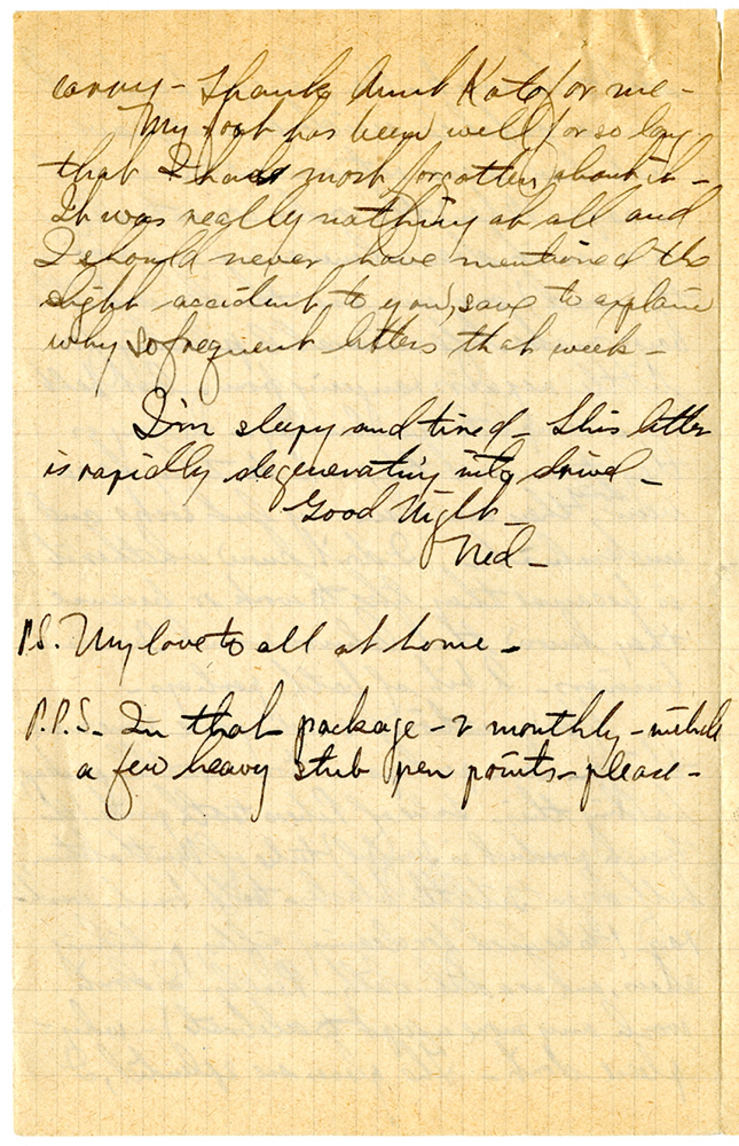 carry. Thank Aunt Kate for me. My foot has been well for so long that I have most forgotten about it. It was really nothing at all and I should never have mentioned the slight accident to you, save to explain why so frequent letters that week. I'm sleepy and tired. This letter is rapidly degenerating into drivel. Good Night. Ned. P.S. My love to all at home. P.P.S. In that package - 2 monthly - include a few heavy stub pen points - please.