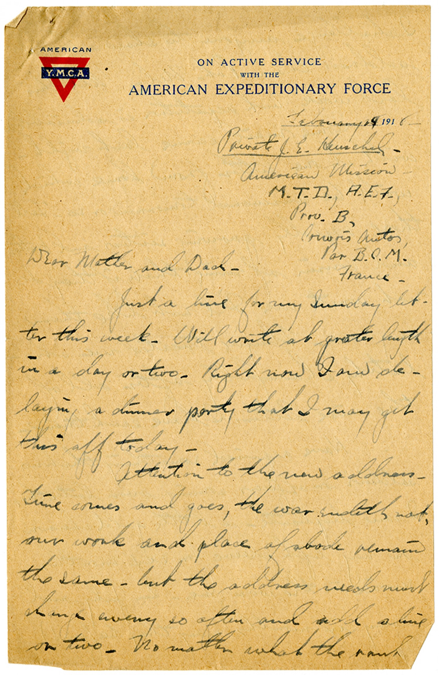 February 19, 1918 - Private J.E. Henschel - American Mission - M.T.D., A.E.F., Prov. B, Convois Autos, Par B.C.M. France - Dear Mother and Dad - Just a line for my Sunday letter this week. Will write at great length in a day or two. Right now I am delaying a dinner party that I may get this off today. Attention to the new address. Time comes and goes, the war endith not, our work and place of abode remain the same - but the address needs must change every so often and add a line or two. No matter what the rank