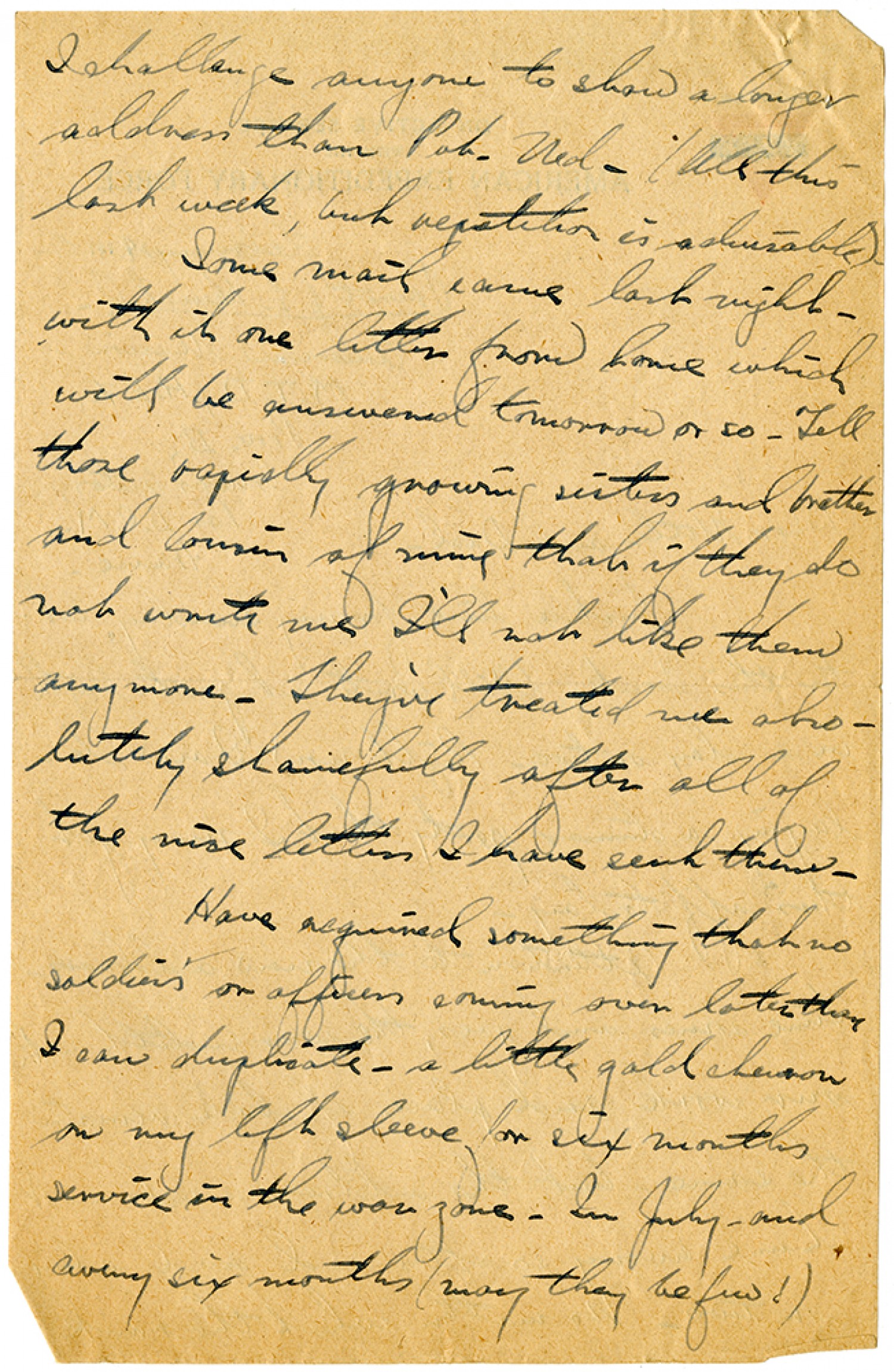 I challenge anyone to show a longer address than Pvt. Ned. (All this last week, but repetition is advisable). Some mail came last night - with it one letter from home which will be answered tomorrow or so. Tell those rapidly growing sisters and brother and cousin of mine that if they do not write me I'll not like them anymore. They've treated me absolutely shamefully after all of the nice letters I have sent them. Have acquired something that no soldiers or officers coming over later than I can duplicate - a little gold chevron on my left sleeve for six months service in the war zone. In July - and six months (may they be few!)