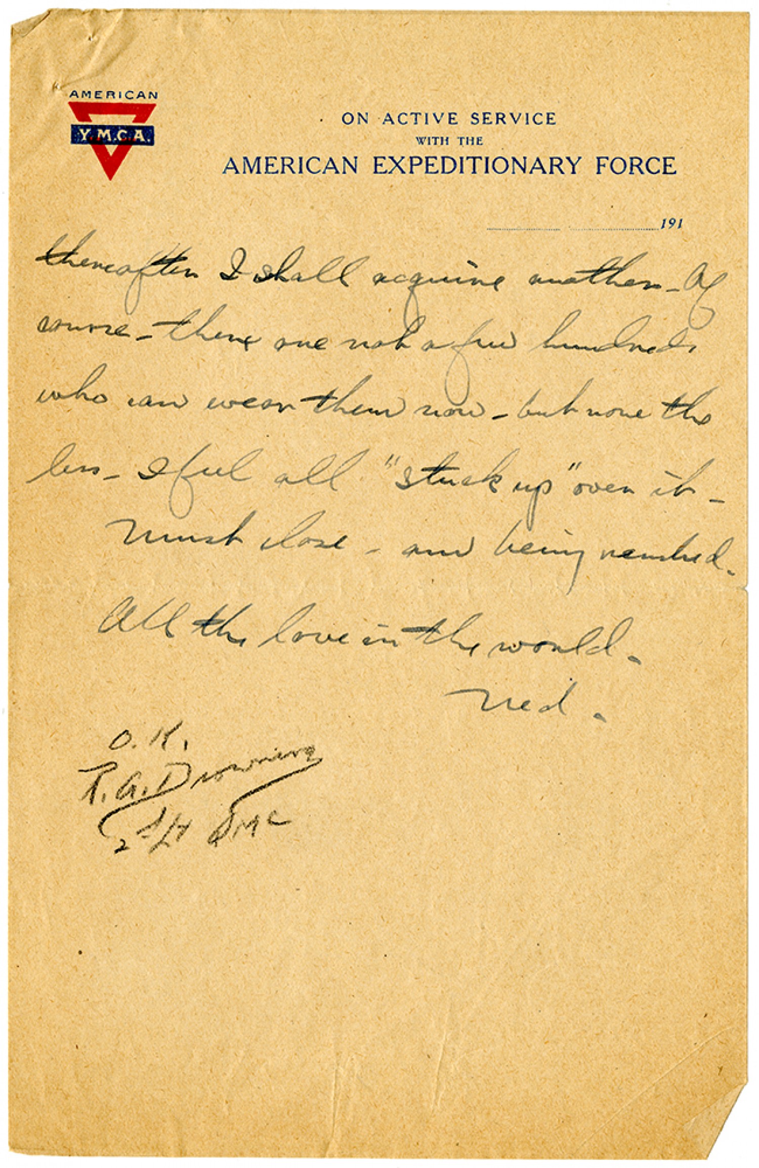 thereafter I shall acquire another. Of course - there are not a few hundred who can wear them now - but none the less - I feel all "stuck up" over it. Must close - am being rushed. All the love in the world. Ned.