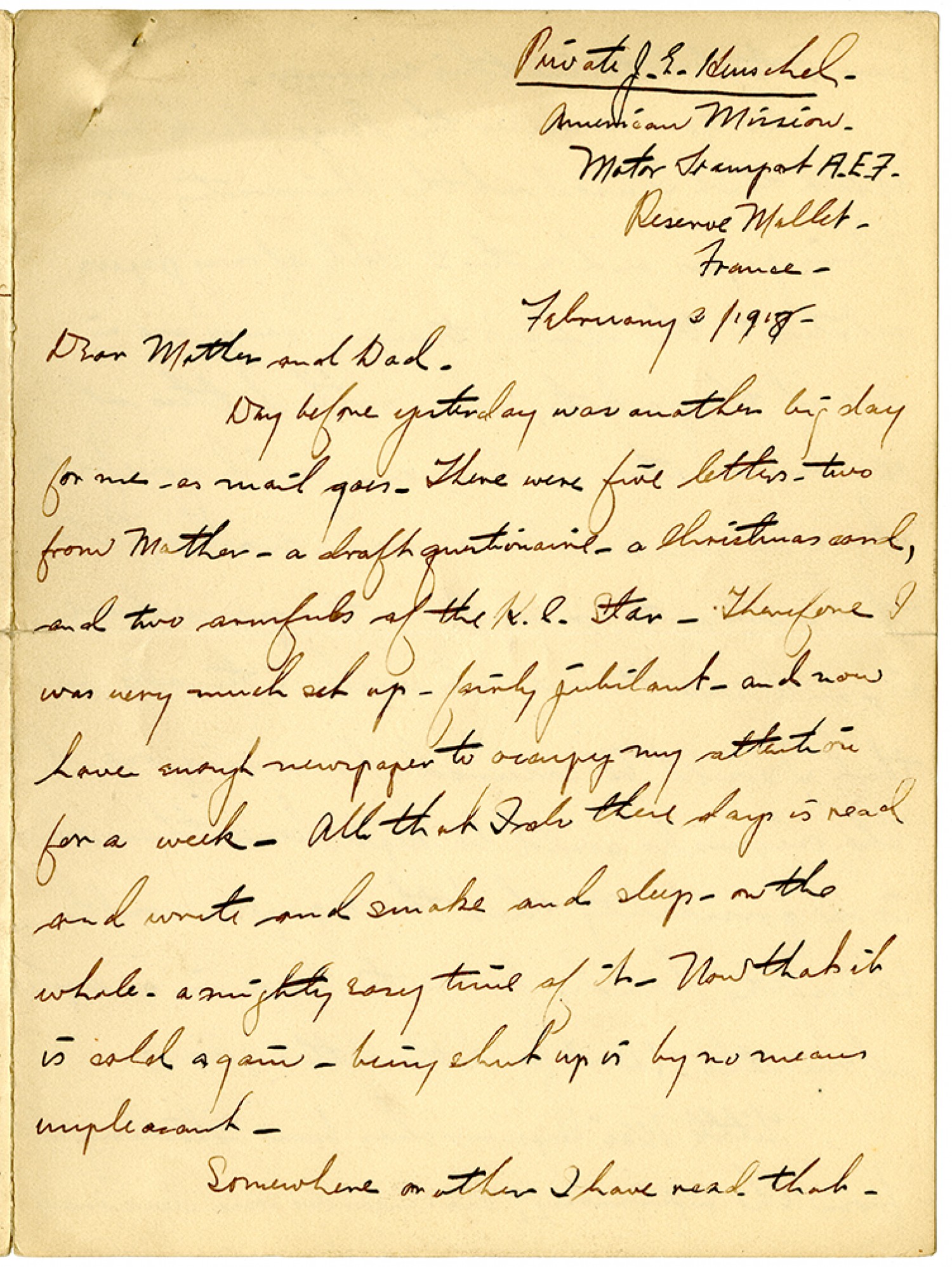 Private J.E. Henschel - American Mission - Motor Transport A.E.F. Reserve Mallet - France - February 3/1918 - Dear Mother and Dad - Day before yesterday was another big day for me - as mail goes. There were five letters - two from Mother - a draft questionaire - a Christmas card, and two armfuls of the [Kansas City] Star. Therefore I was very much set up - fairly jubilant - and now have enough newspaper to occupy my attention for a week. All that I do these days is read and write and smoke and sleep - on the whole - a mighty easy time of it. Now that it is cold again - being shut of by no means unpleasant. Somewhere or other I have read that -