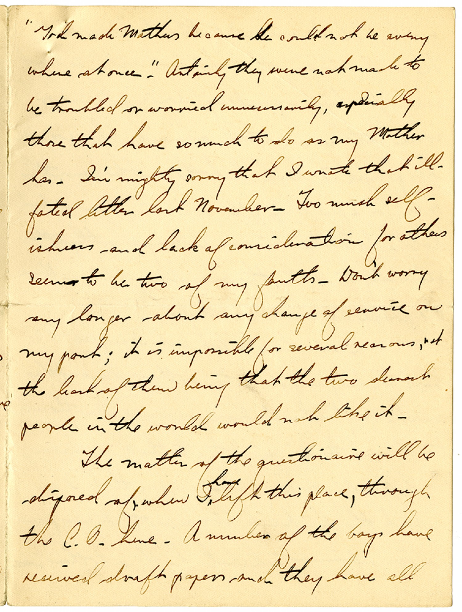 "God made Mothers because he could not be every where at once." Certainly they were not made to be troubled or worried unnecessarily, especially those that have so much to do as my Mother has. I'm mighty sorry that I wrote that ill-fated letter last November. Too much selfishness - and lack of consideration for others seem to be two of my faults. Don't worry any longer about any change of service on my part; it is impossible for several reasons, not the least of them being that the two dearest people in the world would not like it. The matter of the questionaire will be disposed of, when I have left this place, through the C.O. here. A number of the boys have received draft papers and they have all