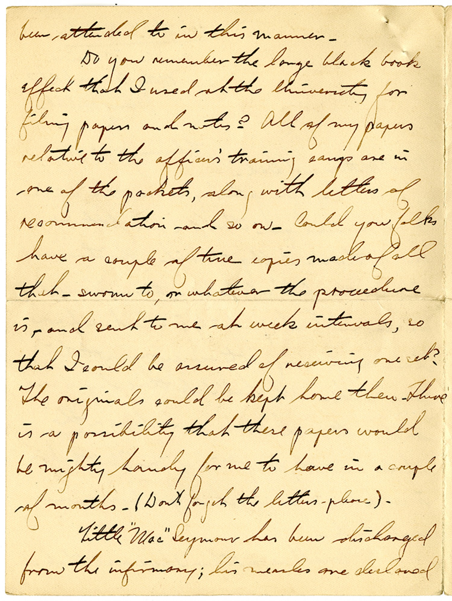 been attended to in this manner. Do you remember the large black book effect that I used at the University for filing paper and notes? All of my papers relative to the officers' training camp are in one of the packets, along with letters of recommendation and so on. Could you folks have a couple of true copies made of all that - sworn to, or whatever the proceedure is, and sent to me at week intervals, so that I could be assured of receiving one set? The originals could be kept home then. There is a possibility that these papers would be mighty handy for me to have in a couple of months. (Don't forget the letters - please). Little "Mac" Seymour has been discharged from the infirmary; his measles are declared