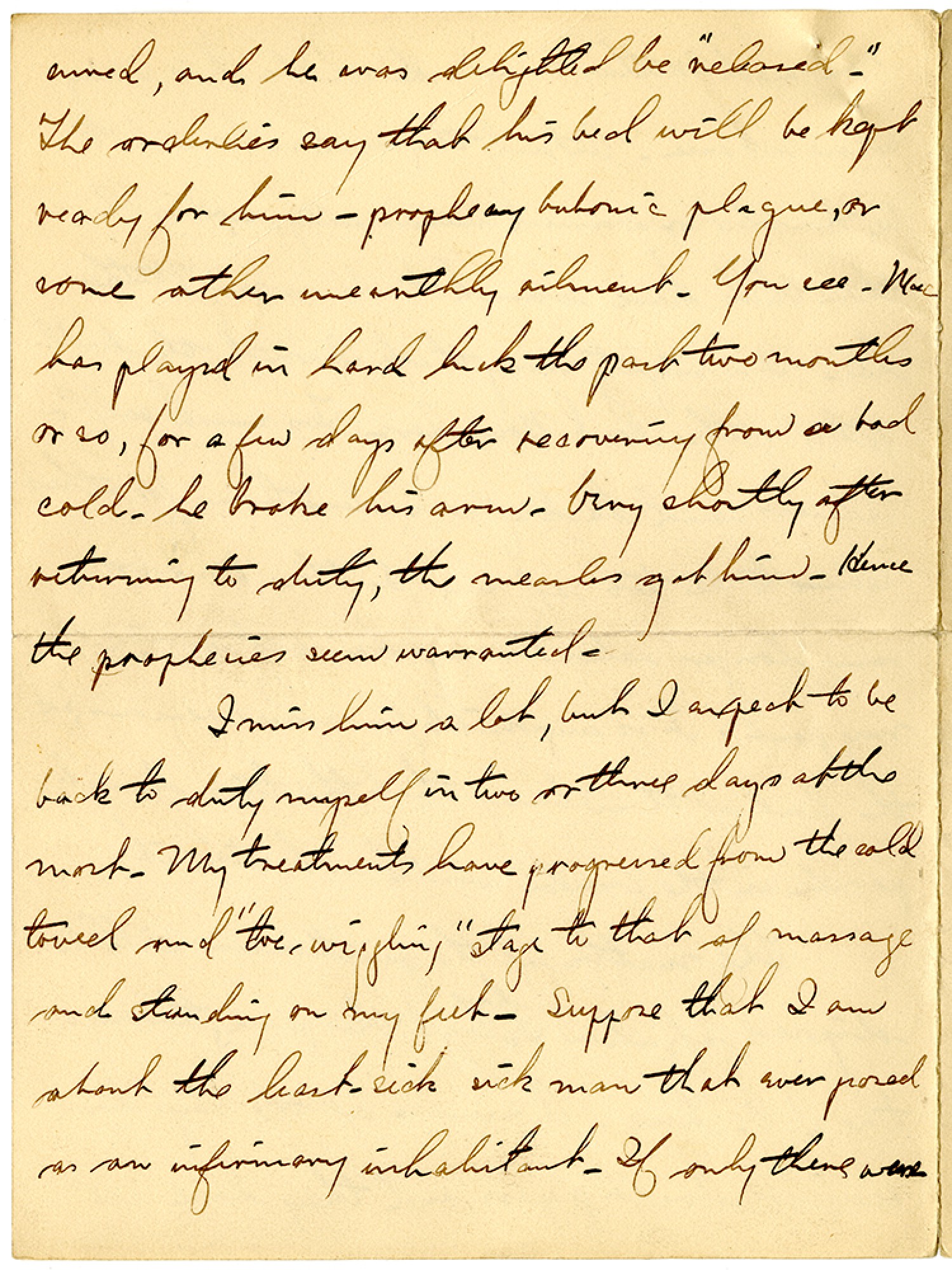 cured, and he was delighted be "released". The orderlies say that his bed will be kept ready for him - prophecy bubonic plague, or some other unearthly ailment. You see - Mac has played in hard luck the past two months or so, for a few days after recovering from a bad cold - he broke his arm - very shortly after returning to duty, the measles got him. Hence the prophecies seem warranted. I miss him a lot, but I expect to be back to duty myself in two or three days at the most. My treatments have progressed from the cold towel and "the wiggling" stage to that of massage and standing on my feet. Suppose that I am about the least-sick man that ever posed as an infirmary inhabitant. If only there were