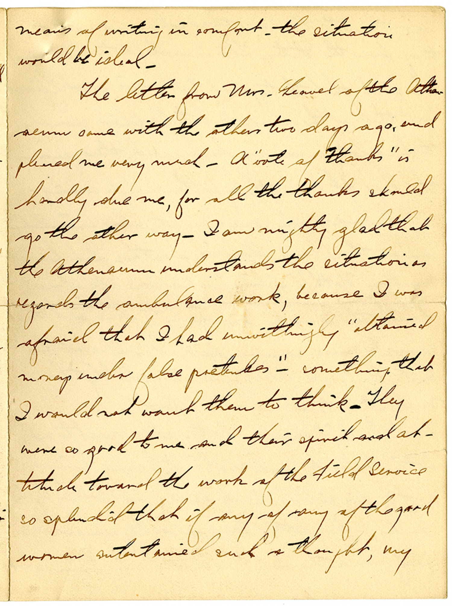 means of writing in comfort - the situation would be ideal. The letter from Mrs. Leavel of the Athenaeum come with the others two days ago, and pleased me very much. A "note of thanks" is hardly due me, for all thanks should go the other way. I am mighty glad that the Athenaeum understands the situation as regards the ambulance work, because I was afraid that I had unwittingly "obtained money under false pretenses" - something that I would not want them to think. They were so good to me and their spirit and attitude toward the work of the Field Service so splendid that if any of any of the good women entertained such a thought, my