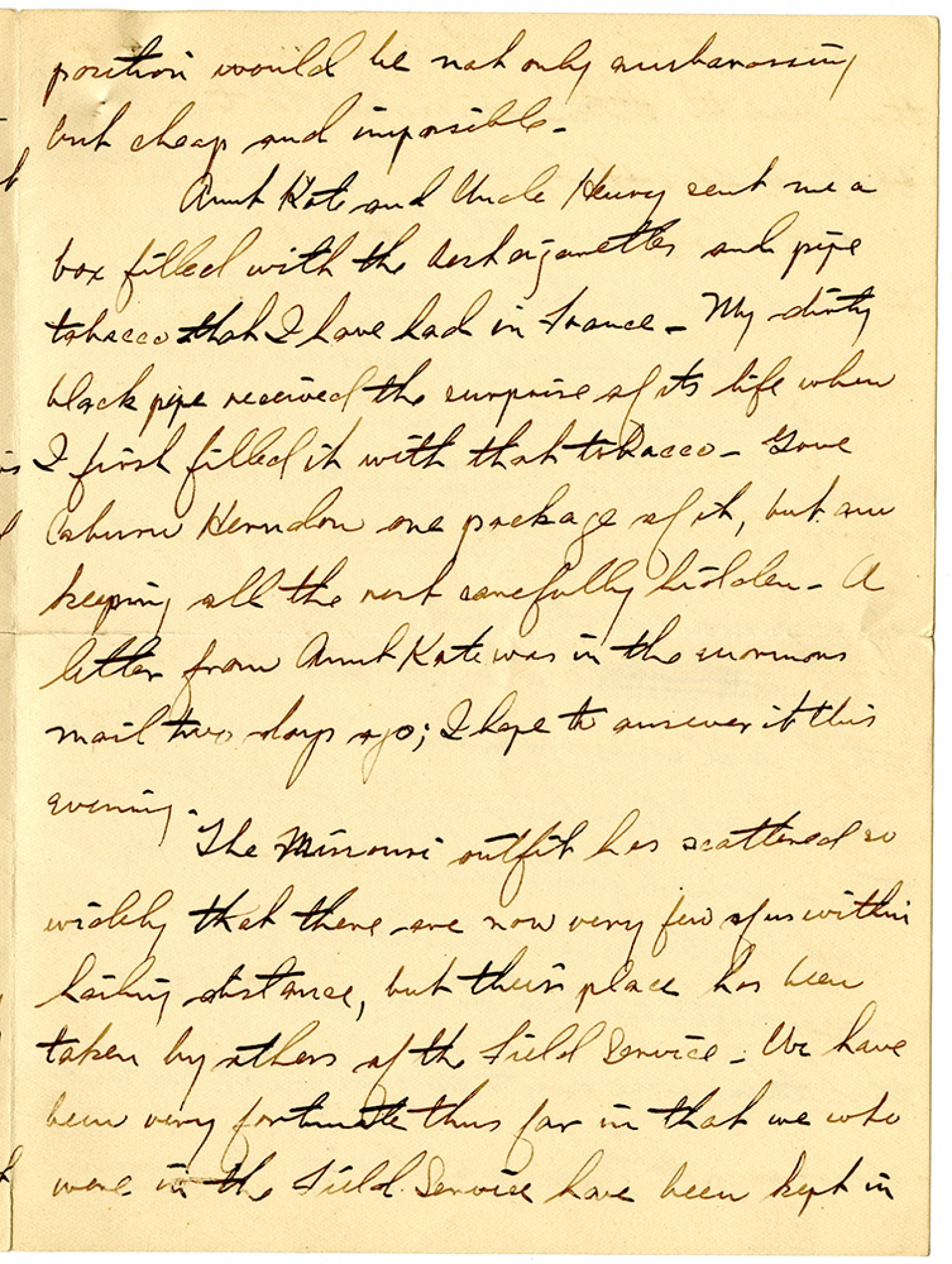 position would be not only embarassing but cheap and imposible. Aunt Kate and Uncle Henry sent me a box filled with the best cigarettes and pipe tobacco that I have had in France. My dirty black pipe received the surprise of its life when I first filled with that tobacco. Gave Coburn Herndon one package of it, but am keeping all the rest carefully hidden. A letter from Aunt Kate was in the enormous mail two days ago; I hope to answer it this evening. The Missouri outfit has scattered so widely that there are now very few of us within hailing distance, but their place has been taken by others of the Field Service. We have been very fortunate thus far in that we who wore in the Field Service have been kept in