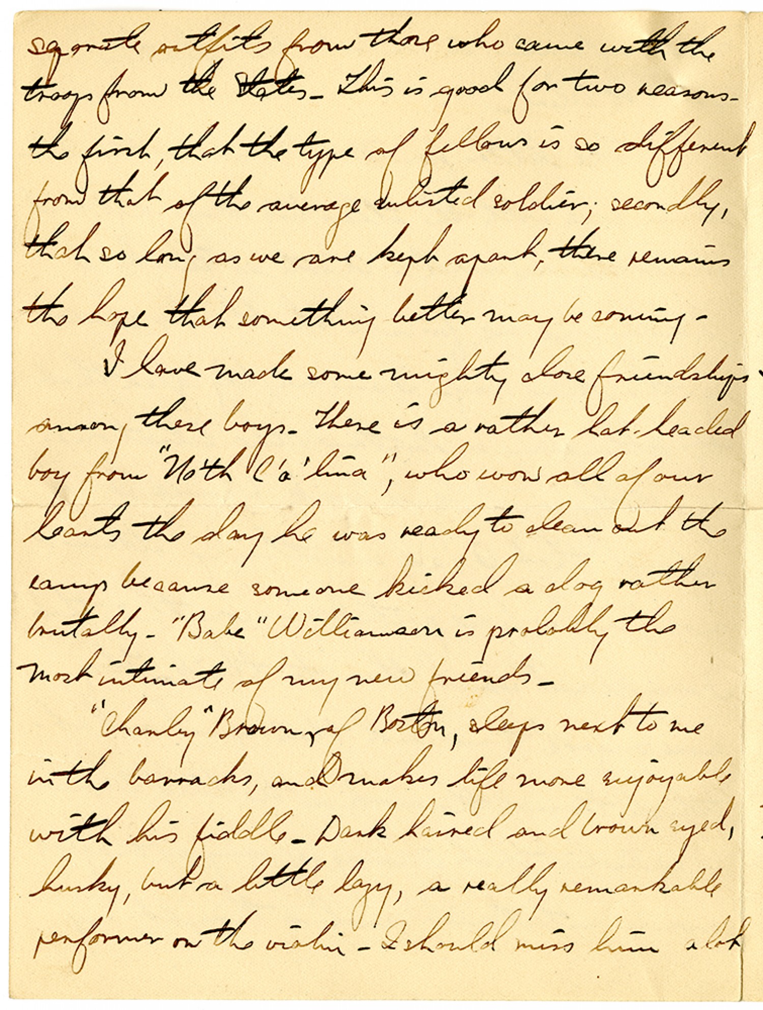 separate outfits from those who come with the troops from the States. This is good for two reasons - the first, that the type of fellows is so different from that of the average enlisted soldier; secondly, that so long as we are kept apart, there remains the hope that something better may be coming. I have made some mighty close friendships among these boys. There is a rather hot-headed boy from "No'th C'o'lina", who won all of our hearts the day he was ready to clean out the camp because someone kicked a dog rather brutally. "Babe" Williamson is probably the most intimate of my new friends. "Charley" Brown, of Boston, sleeps next to me in the barracks, and makes life more enjoyable with his fiddle. Dark haired and brown eyed, husky, but a little lazy, a really remarkable performer on the violin. I should miss him a lot