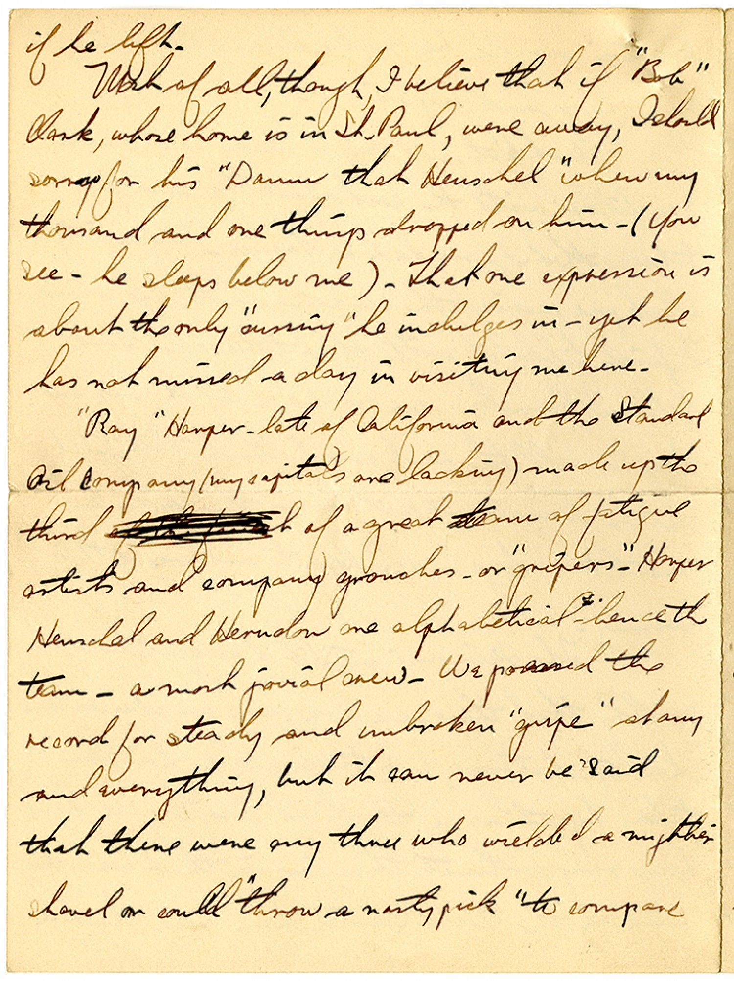 if he left. Most of all, though, I believe that if "Bob" Clark, whose home is St. Paul, were away, I should sorrow for his "Damn that Henschel" when my thousand and one things dropped on him. (You see - he sleeps below me). That one expression is about the only "cussing" he indulges in - yet he has not missed a day in visiting me here. "Ray" Harper - late of California and the Standard Oil Company (my capitals are lacking) made up the third of a great team of fatigue artists and company grouches - or "gripers". Harper Henschel and Herndon are alphabetical - hence the team - a most jovial crew. We possessed the record for steady and unbroken "gripe" slang and everything, but it can never be said that there were any three who wielded a mightier shovel or could "throw a nasty pick" to compare