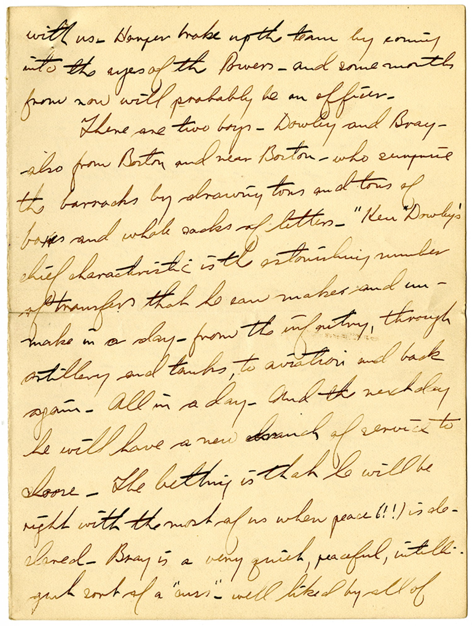 with us. Harper broke up the team by coming into the eyes of the Powers - and some months from now will probably be an officer. There are two boys - Dowley and Bray - also from Boston and near Boston - who surprise the barracks by drawing tons and tons of boxes and whole sacks of letters. "Ken Dowley's chief characteristic is the astonishing number of transfers that he can make and unmake in a day - from the infantry, through artillery and tanks, to aviation and back again. All in a day - And the next day he will have a new branch of service to choose. The betting is that he will be right with the most of us when peace (!!) is declared. Bray is a very quiet, peaceful, intelligent sort of a "cuss" - well liked by all of