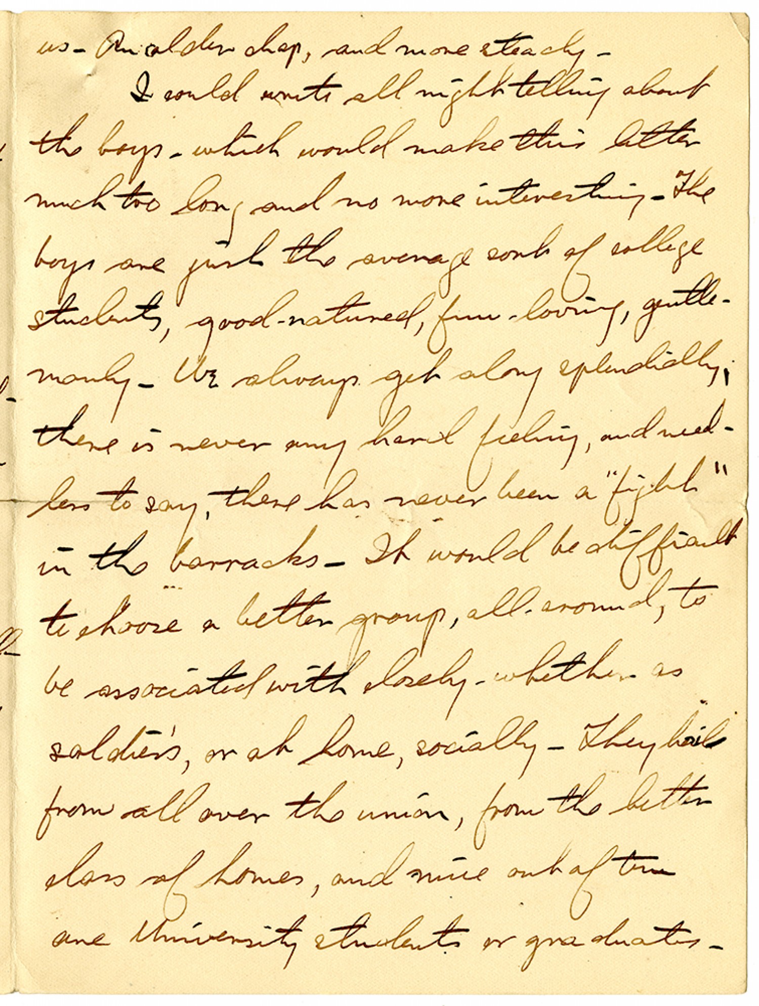us. An older chap, and more steady. I could write all night telling about the boys - which would make this letter much too long and no more interesting. The boys are just the average sort of college students, good-natured, fun-loving, gentlemanly. We always get along splendidly, there is never any hard feeling, and needless to say, there has never been a "fight" in the barracks. It would be difficult to choose a better group, all-around, to be associated with closely - whether as soldier's, or at home, socially. They hail from all over the union, from the better class of homes, and nine out of ten are University students or graduates.