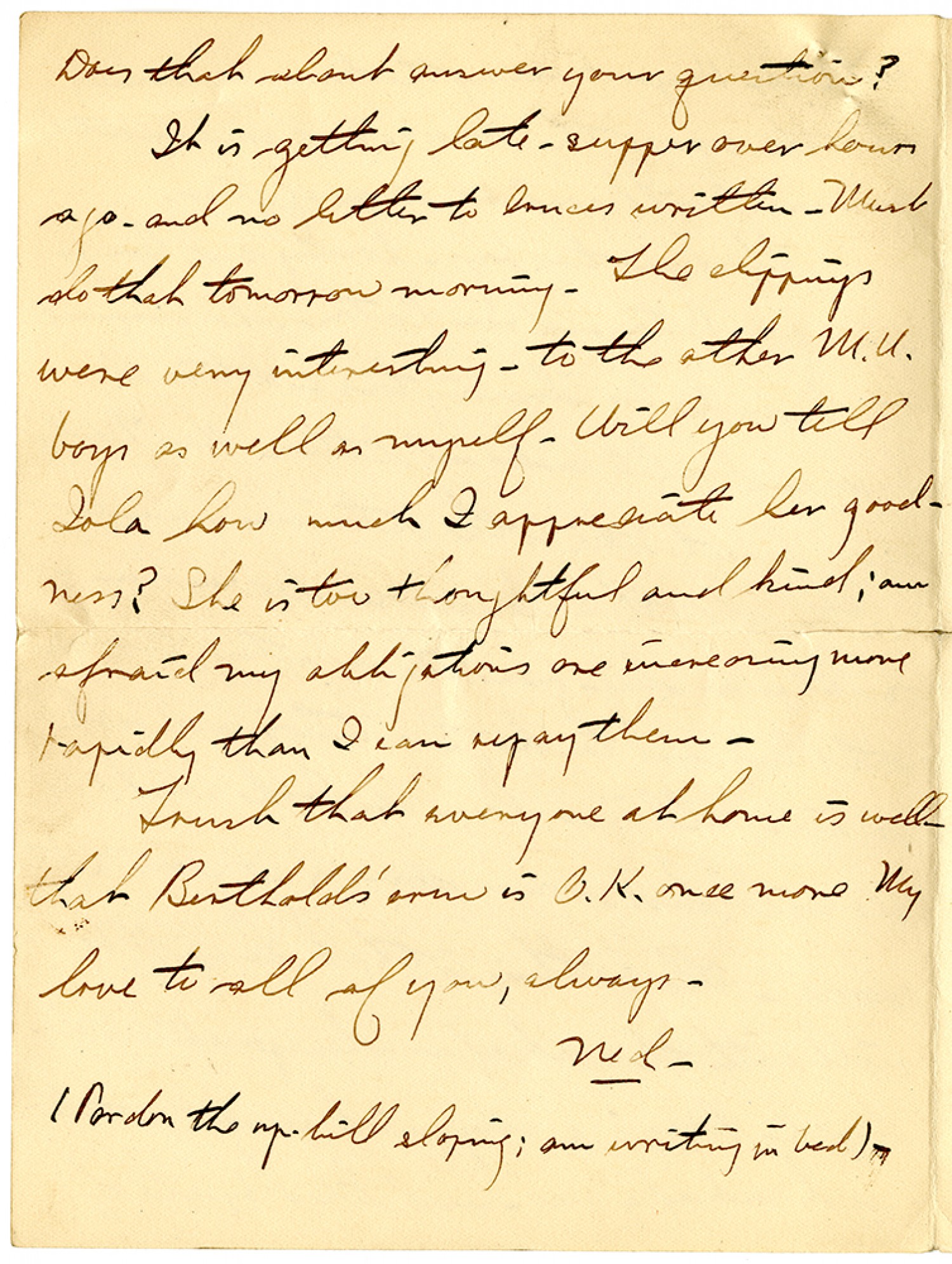 Does that about answer your question? It is getting late - supper over hour ago - and no letters to [ms illegible: 1 wd] written. Must do that tomorrow morning. The clippings were very interesting - the other [Missouri University] boys as well as myself. Will you tell Iola how much I appreciate her goodness? She is too thoughtful and kind; am afraid my obligations are increasing more rapidly than I can repay them. Trust that everyone at home is well - that Berthold's arm is O.K. once more My love to all of you, always - Ned - (Pardon the up-hill sloping; am writing in bed) -