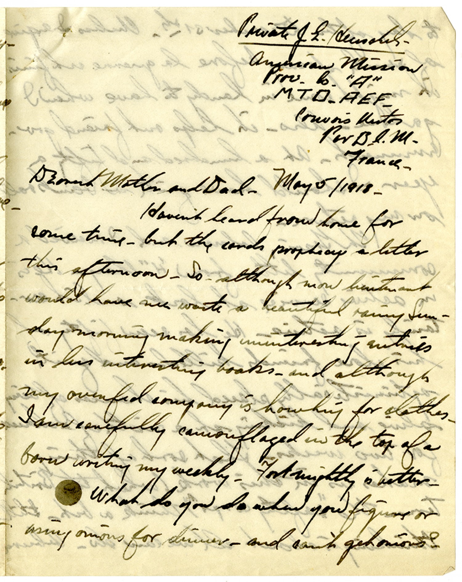 Private J.E. Henschel - American Mission Prov. Co. "A" MTD. AEF - Convois Autos Par B.C.M. France - Dearest Mother and Dad - May 5/1918 - Haven't heard from home for some time - but the cards prophecy a letter this afternoon. So - although now lieutenant would have me waste a beautiful rainy Sunday morning making interesting entries in less interesting books - and although my ovenfed company is howling for clothes - I am carefully camouflaged in the top of a barn writing my weekly. Fort nightly is better. What do you do when you figure or using onions for dinner - and can't get onions?