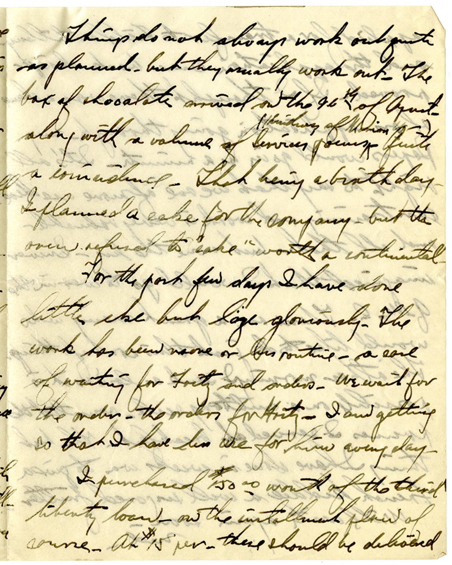 Things do not always work out quite as planned - but they usually work out. The box of chocolate arrived on the 26th of April - along with a volume of service poems (kindness of Marian-) Quite a coincidence. That being a birthday - I planned a cake for the company - but the oven refused to "cake" worth a continental. For the past few days I have done little else but laze gloriously. The work has been more or less routine - a case of waiting for Fritz and orders. We wait for the orders - the orders for Fritz. I am getting so that I have less use for him every day. I purchased $150.00 worth of the third liberty loan - on the installment plan of course. At $15 per - these should be delivered