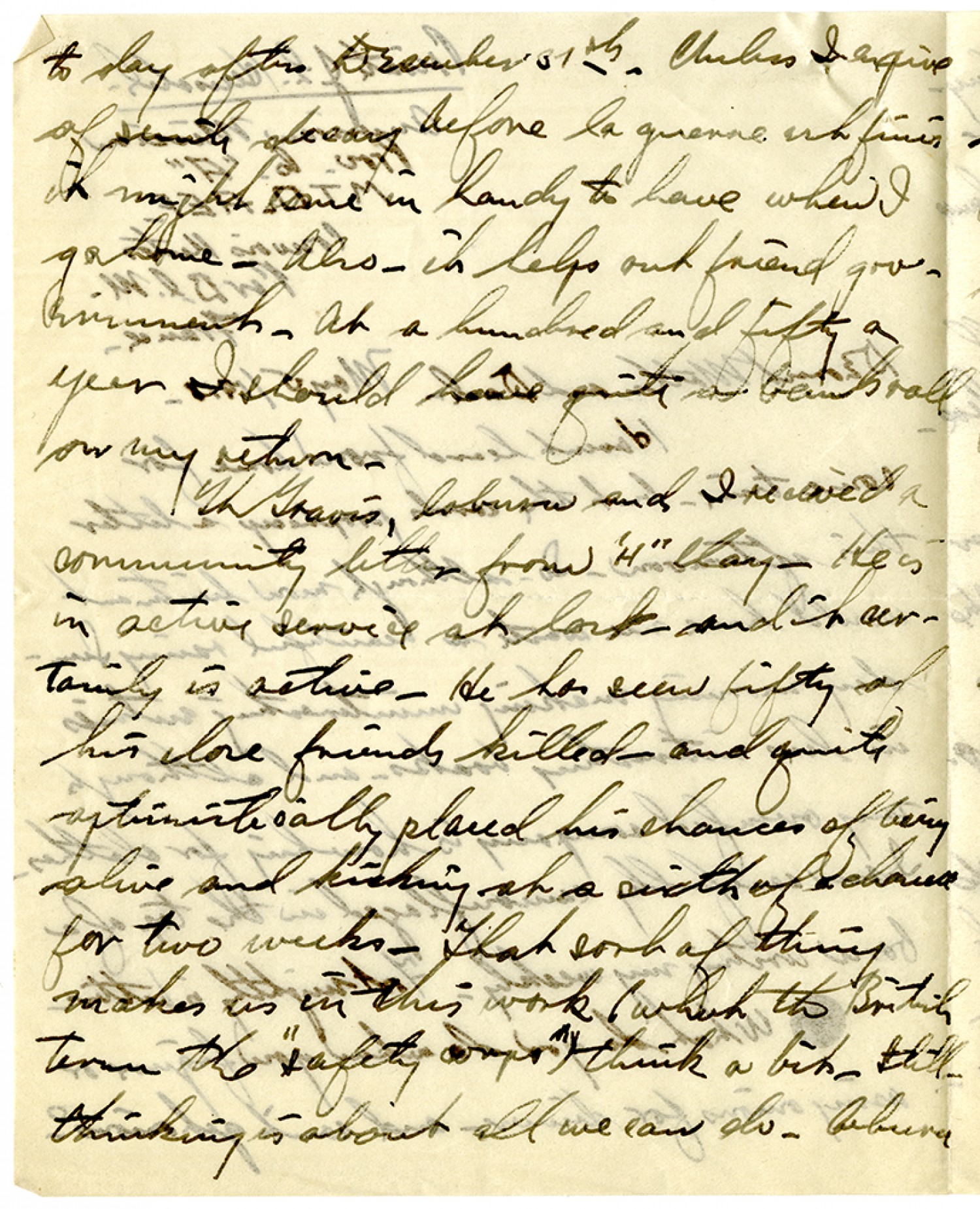 to day after December 31st. Unless I [ms illegible: 1 wd] of [ms illegible: 1 wd] dreary before la guerre est finis - it might come in handy to have when I go home. Also - it helps out friend government. At a hundred and fifty a year I should have quite a bank roll on my return. Lt. Travis, Coburn and I received community letter from "H" Clay. He is in active service at last - and it certainly is active. He has seen fifty of his close friends killed - and quite optimistically placed his chanced of being alive and kicking at a sixth of a chance for two weeks. That sort of thing makes us in the "safety corps" think a bit. Still - thinking is about all we can do. Coburn