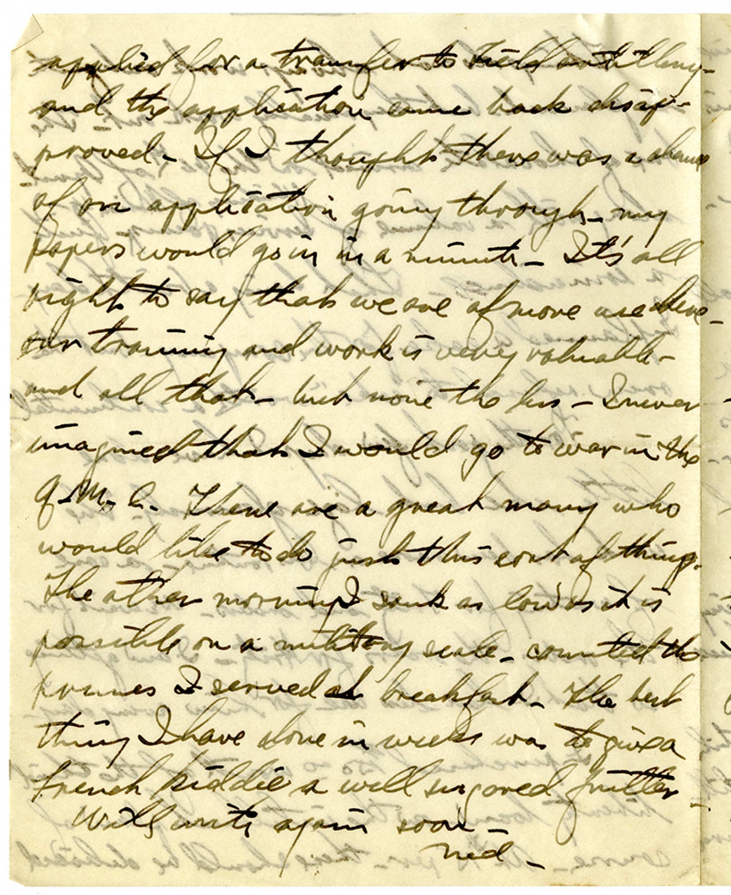 applied for a transfer to Field artillery - and the application came back disapproved. If I thought there was a chance of application going through - my papers would go in a minute. It's all right to say that we are of more use here - our training and work is very valuable - and all that - but none the less - I never imagined that I would go to war in the Q.M.C. There are a great many who would like to do just this sort of thing. The other morning I sank as low as it is possible on a military scale - counted the [ms illegible: 1 wd] I served at breakfast. The best thing I have done in weeks was to give a French kiddie a well [md illegible: 1 wd] fritter. Will write again soon - Ned.