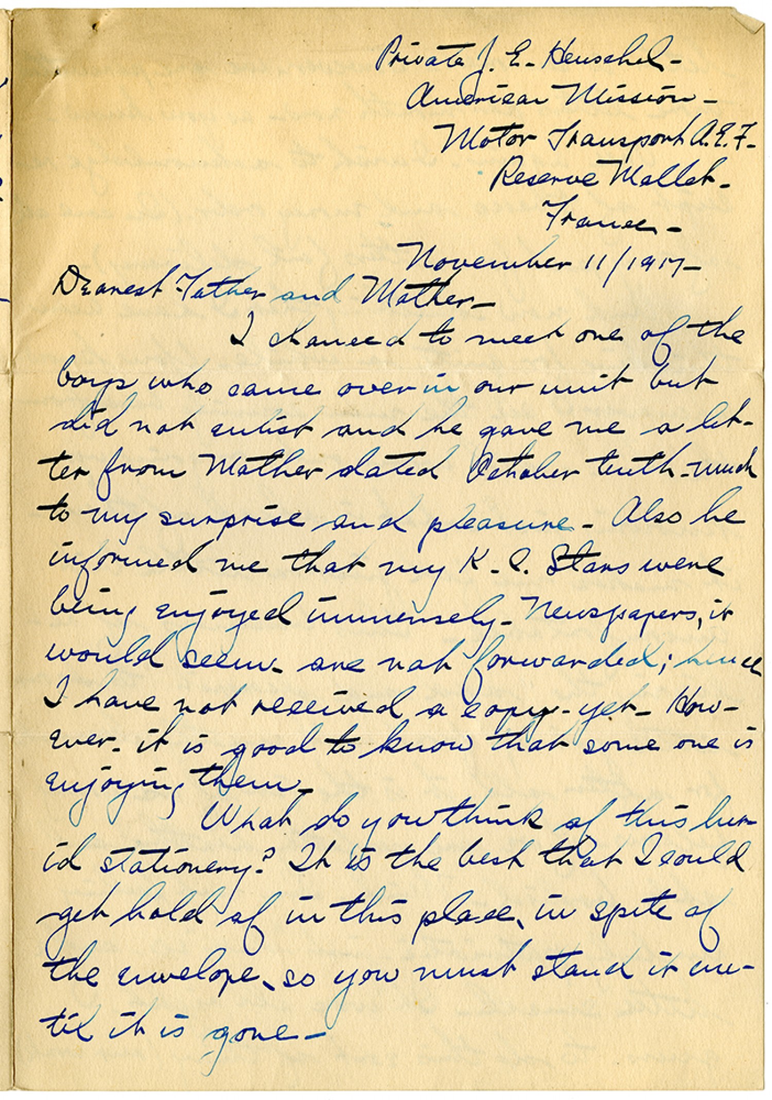 Private J.E. Henschel - American Mission - Motor Transport A.E.F. Reserve Mallet - France - November 11/1917 - Dearest Father and Mother - I chanced to meet one of the boys who came over in our unit but did not enlist and he gave me a letter from Mother dated October tenth - much to my surprise and pleasure. Also he informed me that my [Kansas City] Stars were being enjoyed immensely. Newspapers, it would seem, are not forwarded; hence I have not received a copy - yet. However, it is good to know that some one enjoying them. What do you think of this horid stationery? It is the best that I could get hold of in this place, in spite of the envelope, so you must stand it until it is gone.