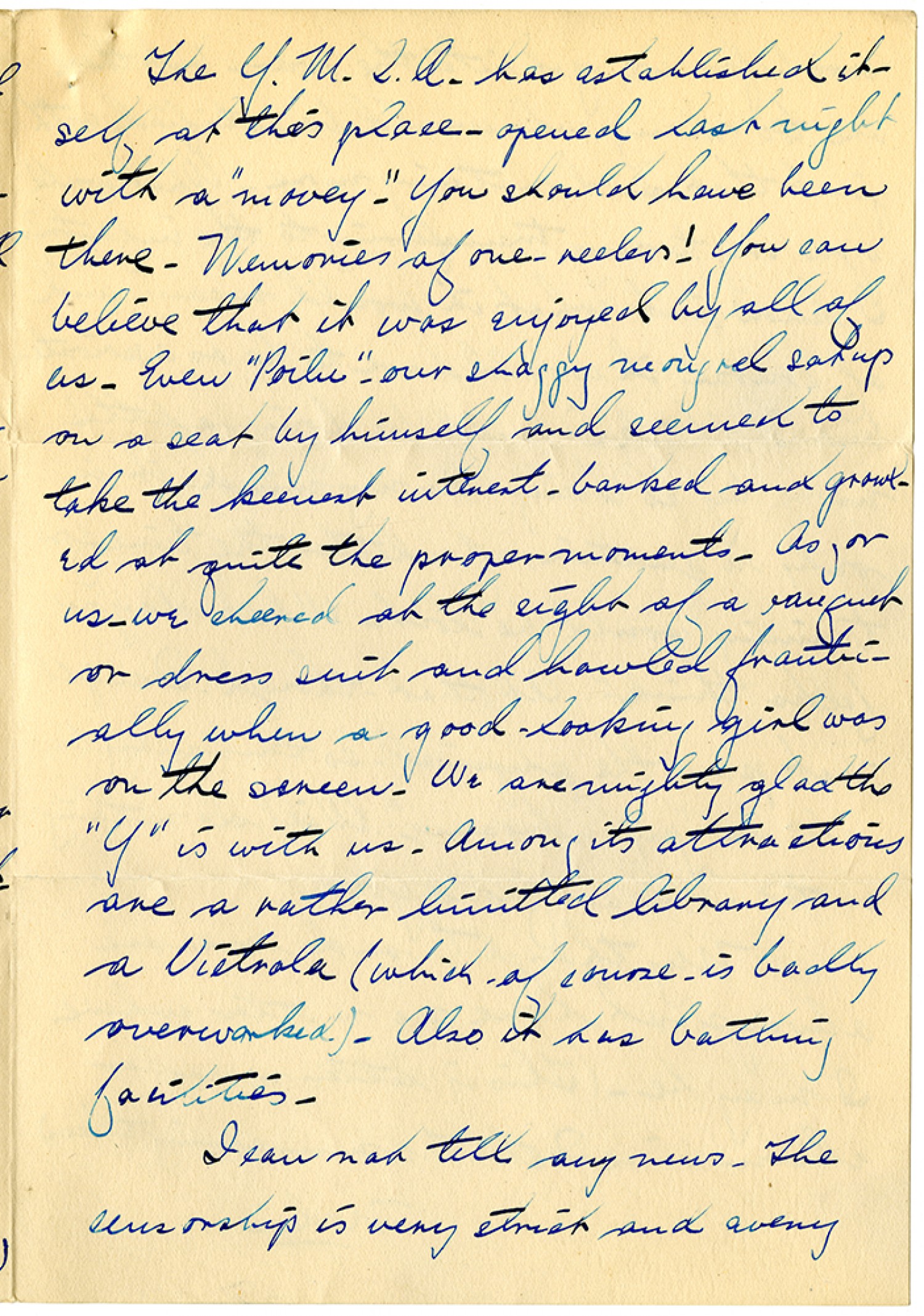 The Y.M.C.A. has established itself at this place - opened last night with a "movey". You should have been there. memories of one-reelers! You can believe that it was enjoyed by all of us. Even "Poilu". our shaggy mongrel sat up on a seat by himself and seemed to take the keenest interest - barked and growled at quite the proper moments. As for us - we cheered at the sight of a [ms illegible: 1 wd] or dress suit and howled frantically when a good-looking girl was on the screen. We are mighty glad the "Y" is with us. Among its attractions are a rather limitted library and a Victrola (which of course - is badly overworked). Also it has bathing facilities. I can not tell any news. The censorship is very strict and every